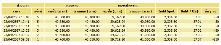 สมาคมค้าทองคำรายงานราคาทองคำไทยวันนี้เปิดตลาดครั้งแรกร่วง 850 บาท/บาททองคำ และเมื่อเวลา 10.48 น.ทองคำเปลี่ยนแปลงราคารวม 6 โครงครั้ง รวมแล้วลดลงเมื่อเทียบกับวานนี้ 1,000 บาท/บาททองคำ ทองคำแท่งขายออกบาทละ 40,400 บาท ทองคำรูปพรรณขายออกบาทละ 40,900 บาท โดยล่าสุด ทองคำเอเชียเคลื่อนไวที่ 2,304 ดอลลาร์สหรัฐ/ออนซ์