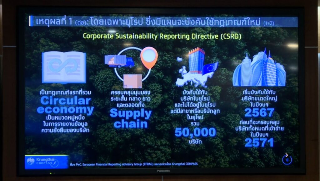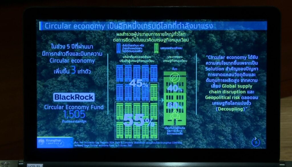 ดร.พชรพจน์ นันทรามาศ ผู้ช่วยกรรมการผู้จัดการใหญ่ และ Chief Economist ธนาคารกรุงไทย เปิดเผยว่า แนวคิดเศรษฐกิจหมุนเวียน (Circular economy) เป็นเมกะเทรนด์โลกที่กำลังมาแรง ในยุคที่ทุกฝ่ายต่างมองหาการเติบโตที่ยั่งยืน และสร้างภูมิคุ้มกันจากปัญหาการขาดแคลนวัตถุดิบ และต้นทุนการผลิตที่อยู่ในระดับสูง จากความเสี่ยงภูมิรัฐศาสตร์และเศรษฐกิจโลกแบ่งขั้ว สะท้อนจากผลสำรวจผู้ประกอบการรายใหญ่ทั่วโลกต่อการยึดมั่นในแนวคิดเศรษฐกิจหมุนเวียน ผู้ประกอบการไทย จึงควรเร่งปรับตัวสู่เศรษฐกิจหมุนเวียน เพื่อสร้างโอกาส และรับมือกับการเปลี่ยนแปลงที่มาพร้อมเมกะเทรนด์ดังกล่าว โดยเฉพาะกฎระเบียบทั่วโลกที่ให้ความสำคัญกับเรื่องนี้มากขึ้น เช่น ยุโรปที่เริ่มบังคับใช้กฎเกณฑ์การเปิดเผยข้อมูลด้านความยั่งยืนฉบับใหม่ (Corporate Sustainability Reporting Directive หรือ CSRD) ในปีงบการเงิน 2567 ซึ่งเป็นครั้งแรกที่รวมปัจจัยเศรษฐกิจหมุนเวียน และมีผลกระทบกับบริษัทมากถึง 50,000 แห่ง ขณะที่ในอีก 2-3 ปีข้างหน้า ยุโรปอาจบังคับใช้มาตรการ Digital Product Passport ที่กำหนดให้ผู้ผลิตต้องเผยแพร่ข้อมูลผลิตภัณฑ์ให้ผู้บริโภคทราบ ซึ่งครอบคลุมด้านเศรษฐกิจหมุนเวียนด้วย เป็นปัจจัยท้าทายต่อผู้ส่งออกของไทย