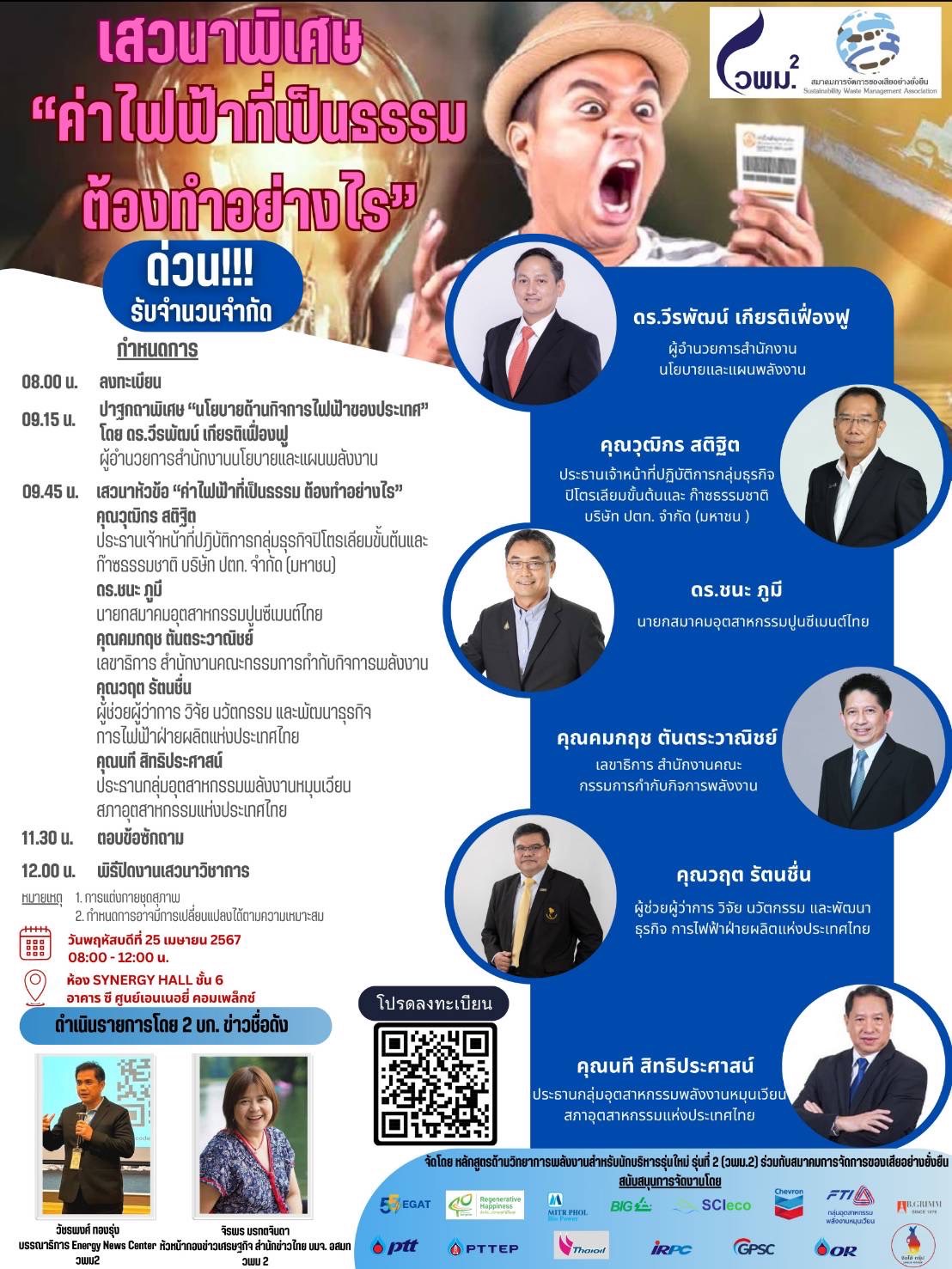 กรุงเทพฯ 23 เม.ย.- วพม.2 -สมาคมการจัดการของเสียอย่างยั่งยืน ร่วมระดมความเห็น การบริหารจัดการค่าไฟฟ้าอย่างมีประสิทธิภาพและเป็นธรรม เพื่อความสามารถในการแข่งขันของประเทศอย่างยั่งยืน จัดเสวนา ”ค่าไฟฟ้าที่เป็นธรรม ต้องทำอย่างไร” 25 เม.ย.67