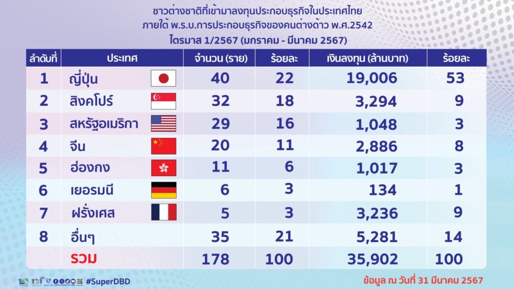 นางอรมน ทรัพย์ทวีธรรม อธิบดีกรมพัฒนาธุรกิจการค้าเปิดเผยว่าไตรมาสแรกปี 2567 (มกราคม-มีนาคม) อนุญาตให้คนต่างชาติเข้ามาลงทุนประกอบธุรกิจในประเทศไทย ภายใต้พระราชบัญญัติการประกอบธุรกิจของคนต่างด้าว พ.ศ.2542 จำนวน 178 ราย โดยเป็นการลงทุนผ่านช่องทางการขอรับใบอนุญาตประกอบธุรกิจของคนต่างด้าว จำนวน 53 ราย และการขอหนังสือรับรองการประกอบธุรกิจของคนต่างด้าว (ผ่านช่องทางการลงทุนตามกฎหมายว่าด้วยการส่งเสริมการลงทุน หรือได้รับอนุญาตตามกฎหมายว่าด้วยการนิคมอุตสาหกรรมแห่งประเทศไทย และการใช้สิทธิตามสนธิสัญญาหรือความตกลงระหว่างประเทศ) จำนวน 125 ราย เงินลงทุนรวมทั้งสิ้น 35,902 ล้านบาท จ้างงานคนไทย 849 คน