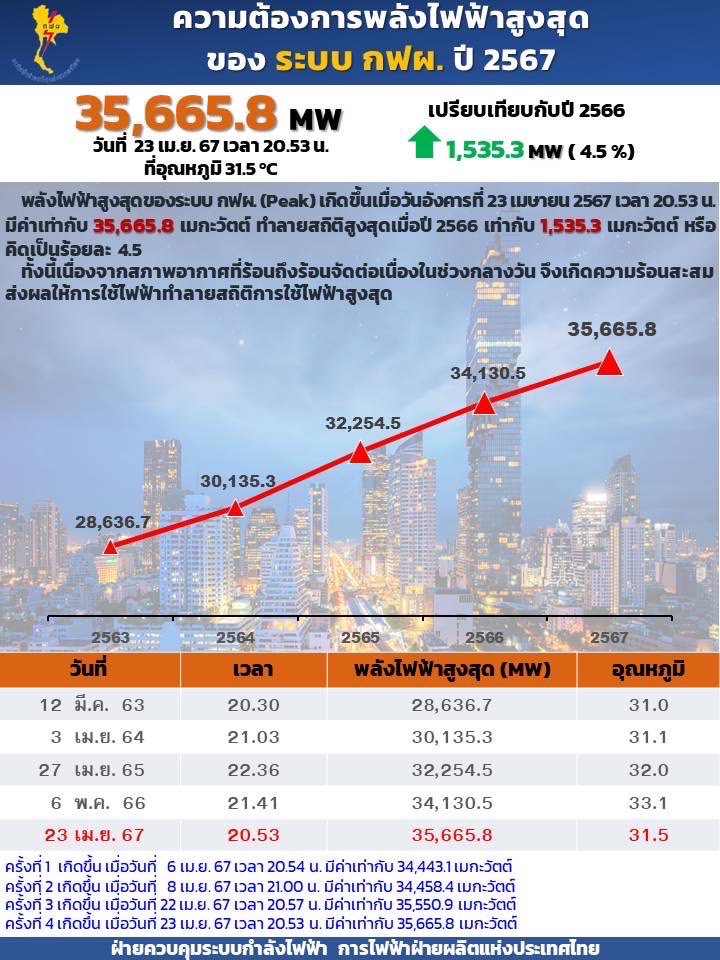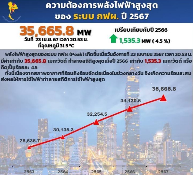 การไฟฟ้าฝ่ายผลิตแห่งประเทศไทยไทย แจ้งว่า จากอากาศร้อนจัดในปีนี้ ทำให้การใช้ไฟฟ้าพุ่งขึ้นทำลายสถิติสูงสุด (พีก) อย่างต่อเนื่อง โดยล่าสุดได้เกิดพีกของประเทศครั้งใหม่ เมื่อวันที่ 23 เม.ย.67 เวลา 22.53น. ที่ 35,665.8 เมกะวัตต์ โดยอุณหภูมิเฉลี่ยอยู่ที่ 31.5 องศาเซลเซียส โดยความต้องการพลังไฟฟ้าสูงสุดที่เกิดขึ้นเมื่อคืน สูงกว่าปีที่แล้ว 1,535.3 เมกะวัตต์ หรือ ร้อยละ 4.5 เนื่องจากสภาอากาศที่ร้อนถึงร้อนจัดในช่วงกลางวัน จึงเกิดความร้อนสะสม ส่งผลให้การใช้ไฟฟ้าสูงสุด ทำลายสถิติการใช้ไฟฟ้าสูงสุดของประเทศและกลายเป็นสถิติใหม่อีกครั้ง
