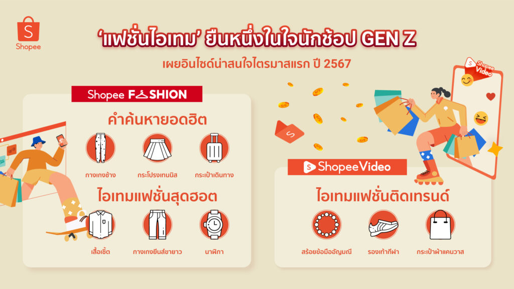 จากการรายงานของ The Future of Shopping: Engaging Generation Z Shoppers in the Digital Era ยังเผยอีกว่าร้อยละ 73 ของนักช้อป GEN Z ในประเทศไทย ให้ความสนใจ ‘สินค้าแฟชั่น’ ทำให้ช้อปปี้เล็งเห็นพฤติกรรมการช้อปปิ้งกับสินค้าในหมวดหมู่นี้ ถือเป็นกลุ่มที่น่าจับตามองในกลุ่มสินค้าแฟชั่น โดยเราพบอินไซด์ที่น่าสนใจจากข้อมูลเชิงลึกบนช้อปปี้ในช่วงไตรมาสแรกของปี 2567 เช่น เสื้อเชิ้ต, กางเกงยีนส์ขายาว และนาฬิกา