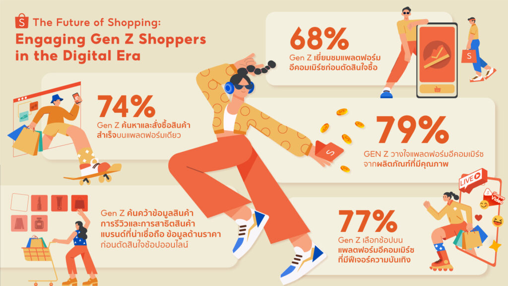 ช้อปปี้ (Shopee) แพลตฟอร์มอีคอมเมิร์ซ เปิดเผยข้อมูล ล่าสุดเกี่ยวกับพฤติกรรมนักช้อป Gen Z เป็นกลุ่มคนเติบโตขึ้นอย่างรวดเร็ว ในการช้อปปิ้งออนไลน์ผ่านอีคอมเมิร์ซแพลตฟอร์ม จากการสำรวจช้อปปิ้งออนไลน์ พบว่าร้อยละ 68 ของนักช้อป Gen Z เยี่ยมชมแพลตฟอร์มอีคอมเมิร์ซก่อนตัดสินใจซื้อสินค้า โดยพฤติกรรมการช้อปปิ้งออนไลน์ของนักช้อป GEN Z คำนึงถึงการค้นคว้าข้อมูลสินค้า การรีวิวและการสาธิตสินค้า ความไว้วางใจจากแบรนด์ที่น่าเชื่อถือ รวมทั้งข้อมูลทางด้านราคาก่อนตัดสินใจซื้อ