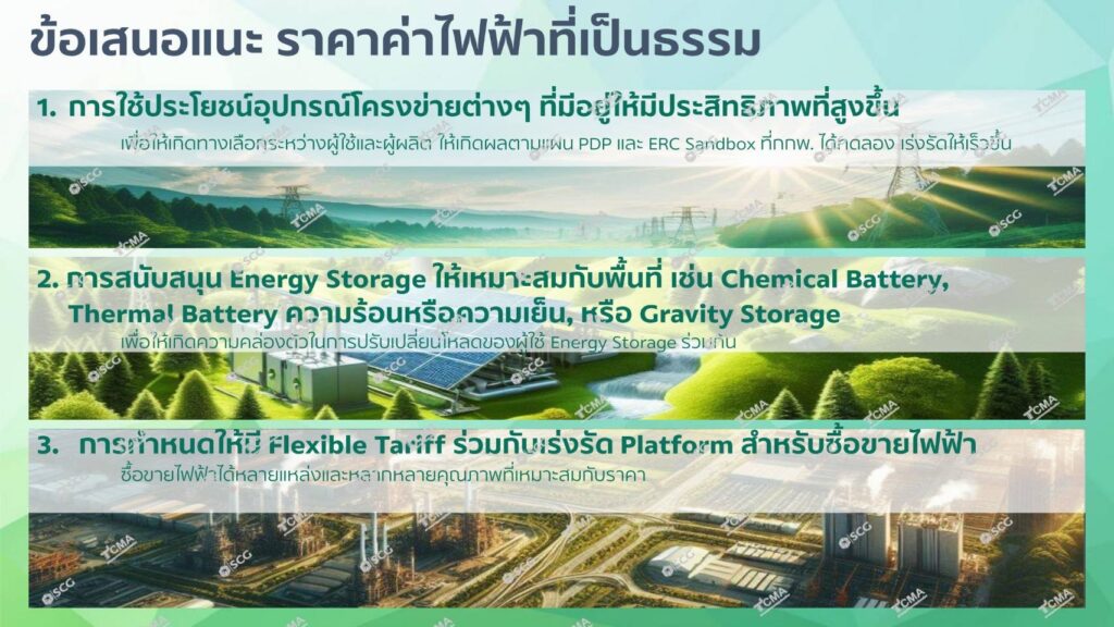 นายชนะ ภูมี ผู้ช่วยผู้จัดการใหญ่-การบริหารความยั่งยืน บริษัท ปูนซิเมนต์ไทย จำกัด (มหาชน) (SCC) และนายกสมาคมอุตสาหกรรมปูนซีเมนต์ไทย (TCMA)กล่าวว่า ไฟฟ้านับเป็นโครงสร้างพื้นฐานของประเทศในการพัฒนาเศรษฐกิจ สังคม และรักษาสิ่งแวดล้อมอย่างยั่งยืน ภายใต้สภาวะผันผวนตามบริบทโลก จึงต้องรักษาสมดุลทั้งด้านเสถียรภาพ ความเป็นมิตรต่อสิ่งแวดล้อม และความเป็นธรรม ที่ผ่านมาทางผู้ผลิตกลุ่มซีเมนต์ภายใต้ TCMA ได้พัฒนาเทคโนโลยีเพื่อเพิ่มการใช้พลังงาน และ renewable energy ทั้งจาก WHG solar biomass และ waste มีการพัฒนา micro grid และ load curve management เพื่อบริหารจัดการพลังงานทั้งฝั่ง demand และ supply ให้เกิดประโยชน์สูงสุด และมีต้นทุนที่สามารถแข่งขันได้