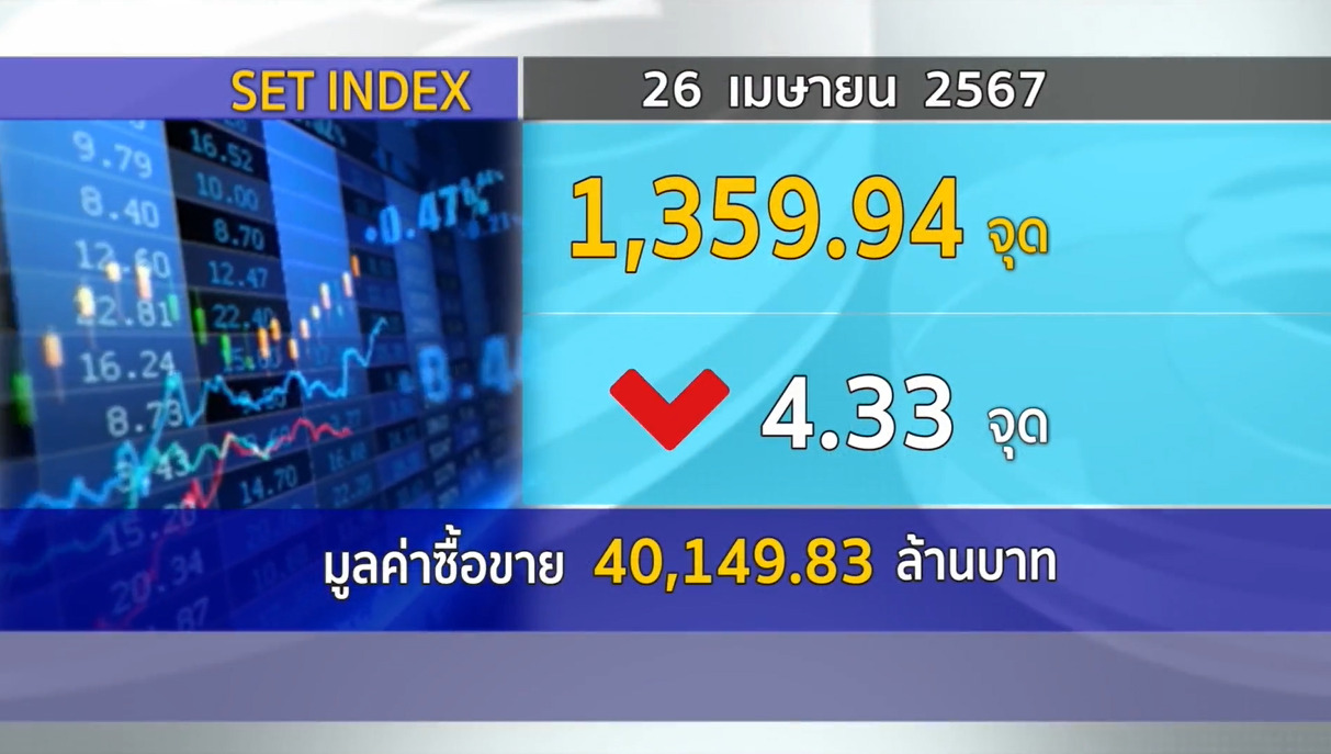 กทม. 26 เม.ย.-SET ปิดวันนี้ที่ 1,359.94 จุด ลดลง 4.33 จุด (-0.32%) มูลค่าการซื้อขาย 40,183.94 ล้านบาท