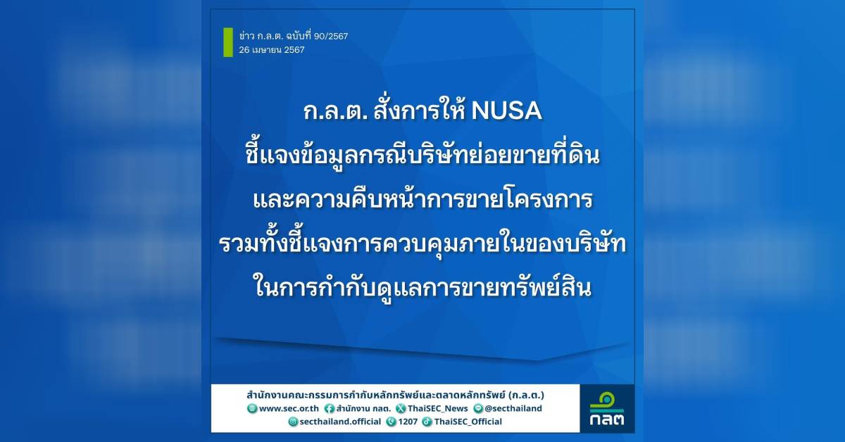 กรุงเทพฯ 26 เม.ย.- ก.ล.ต. สั่งการให้ NUSA ชี้แจงข้อมูลกรณีบริษัทย่อยขายที่ดินและความคืบหน้าการขายโครงการ รวมทั้งชี้แจงการควบคุมภายในของบริษัทในการกำกับดูแลการขายทรัพย์สิน ภายใน 3 เม.ย.67