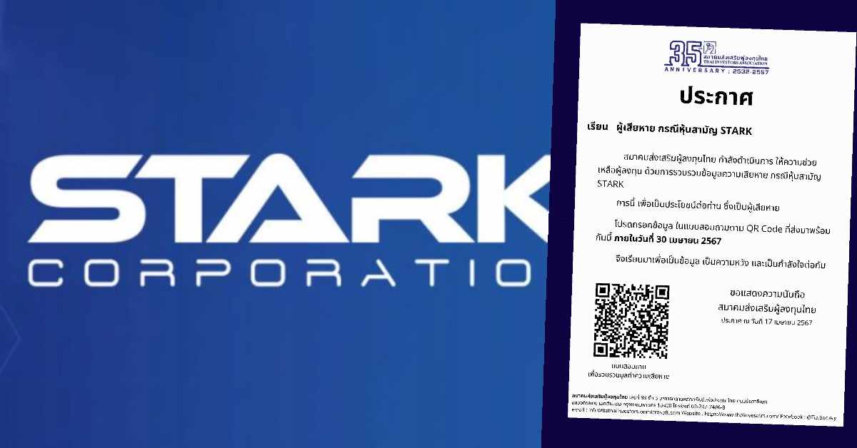 สมาคมส่งเสริมผู้ลงทุนไทย (TIA) ชวนผู้เสียหายลงทุนในหุ้นสามัญ STARK ลงทะเบียนข้อมูลความเสียหาย เพื่อทำการช่วยเหลือเป็นลำดับไปนักลงทุนที่เสียหาย กรณีหุ้นสามัญ STARK อย่าพลาด! ขอให้รีบลงทะเบียนกรอกข้อมูลกับ TIA ตามลิงค์ที่แนบด่วน! เพื่อสรุปข้อมูลความเสียหายทั้งหมดตามกระบวนการและตามขั้นตอนในการให้ความช่วยเหลือ