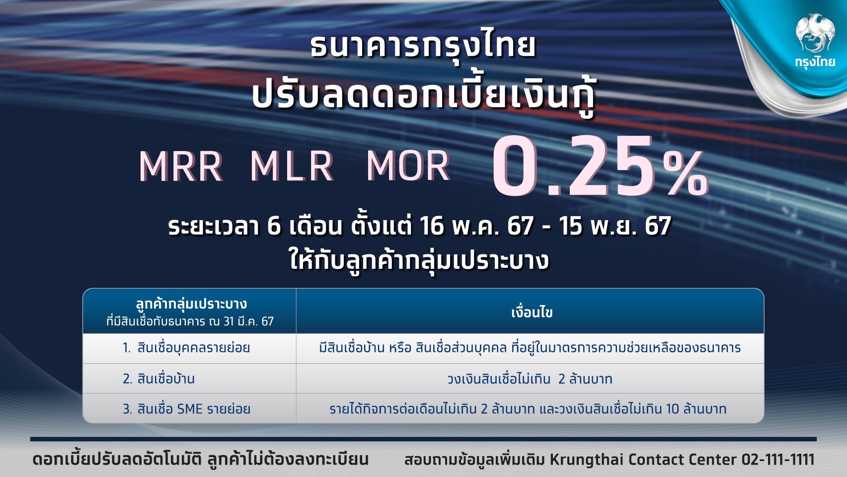 นายผยง ศรีวณิช กรรมการผู้จัดการใหญ่ ธนาคารกรุงไทย เปิดเผยว่า ธนาคารกรุงไทยพร้อมสนับสนุนแนวนโยบายของภาครัฐในการช่วยเหลือกลุ่มเปราะบาง ตามแนวทางของสมาคมธนาคารไทยในการลดภาระดอกเบี้ยให้กับลูกค้ากลุ่มเปราะบาง ทั้งลูกค้าบุคคลและผู้ประกอบการ SME รายย่อย และแนวทางการแก้อย่างหนี้ยั่งยืนและการให้สินเชื่ออย่างรับผิดชอบและเป็นธรรม (Responsible Lending) ของธนาคารแห่งประเทศไทย ธนาคารจึงมีมาตรการช่วยเหลือเพิ่มเติม โดยประกาศปรับลดอัตราดอกเบี้ยเงินกู้ MRR MLR และ MOR 0.25% ต่อปี เป็นเวลา 6 เดือน มีผลตั้งแต่วันที่ 16 พฤษภาคม – 15 พฤศจิกายน 2567 ให้กับลูกค้ากลุ่มเปราะบาง 3 กลุ่ม ได้แก่ 1. ลูกค้าสินเชื่อบุคคลรายย่อยที่ยังอยู่ในมาตรการความช่วยเหลือของธนาคารฯ ทั้งสินเชื่อบ้าน และสินเชื่อส่วนบุคคล 2.ลูกค้าสินเชื่อบ้านที่มีวงเงินไม่เกิน 2 ล้านบาท และ 3. ลูกค้าที่เป็นผู้ประกอบการ SME รายย่อยที่มีรายได้กิจการต่อเดือนไม่เกิน 2 ล้านบาทและมีวงเงินสินเชื่อไม่เกิน 10 ล้านบาท