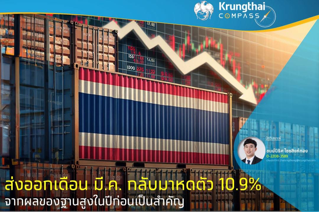 ส่งออกเดือน มี.ค. พลิกกลับมาหดตัว 10.9%YoY ติดลบครั้งแรกในรอบ 8 เดือน จากผลของฐานที่สูงในปีก่อนหน้า ประกอบกับสภาพอากาศแปรปรวนทำให้สินค้าเกษตรออกสู่ตลาดล่าช้า โดยการส่งออกสินค้าอุตสาหกรรมและอุตสาหกรรมเกษตรหดตัว ขณะที่สินค้าเกษตรขยายตัวในอัตราที่ชะลอลง ส่วนการนำเข้าเติบโตเร่งขึ้นที่ 5.6%YoY ส่งผลให้ดุลการค้าเดือน มี.ค. ขาดดุลติดต่อกันเป็นเดือนที่ 3 ที่ระดับ 1,163.3 ล้านดอลลาร์ฯ