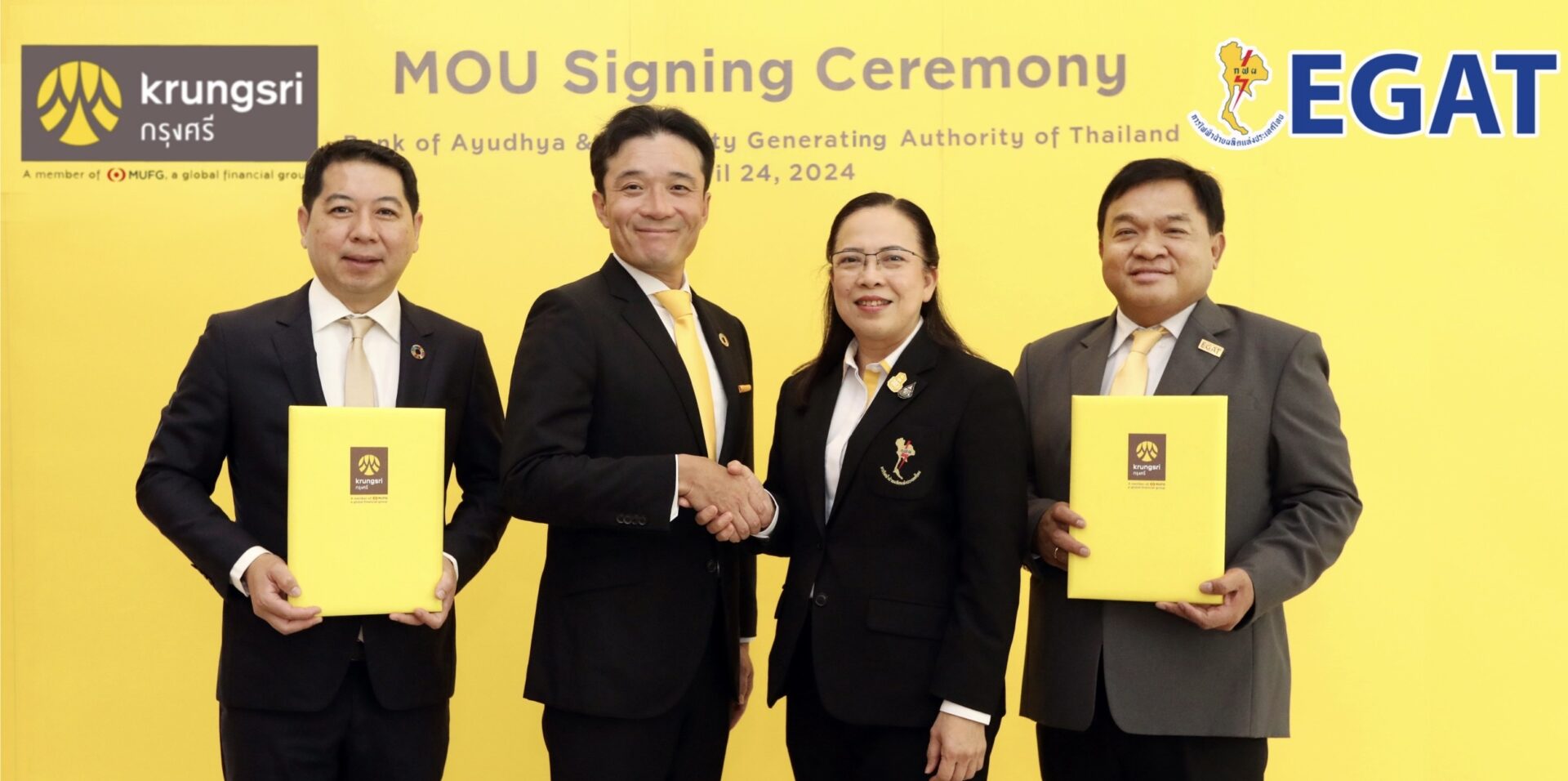 การไฟฟ้าฝ่ายผลิตแห่งประเทศไทย (กฟผ.) และธนาคารกรุงศรีอยุธยา จำกัด (มหาชน) ร่วมลงนามบันทึกความร่วมมือด้านการส่งเสริม Smart Energy Solutions เพื่อศึกษาและส่งเสริมทางเลือกด้าน Green and Smart Energy Solutions แลกเปลี่ยนความรู้เกี่ยวกับพลังงานหมุนเวียน และระบบโครงข่ายอัจฉริยะขนาดเล็ก (Smart Micro-Grid) รวมถึงกลไกการลดก๊าซเรือนกระจก อาทิ ใบรับรองพลังงานหมุนเวียน และระบบประหยัดพลังงานอัจฉริยะให้กับภาคธุรกิจ โดยมี ดร.จิราพร ศิริคำ รองผู้ว่าการธุรกิจเกี่ยวเนื่อง กฟผ. นายเคนอิจิ ยามาโตะ กรรมการผู้จัดการใหญ่และประธานเจ้าหน้าที่บริหาร ธนาคารกรุงศรีอยุธยา จำกัด (มหาชน) เป็นผู้ลงนาม พร้อมด้วยนายบุนเซอิ โอคุโบะ ประธานกลุ่มธุรกิจธนกิจพาณิชย์เกี่ยวกับญี่ปุ่นและบรรษัทข้ามชาติ ธนาคารกรุงศรีอยุธยา จำกัด (มหาชน) นายประกอบ เพียรเจริญ ประธานคณะเจ้าหน้าที่ด้านลูกค้าธุรกิจขนาดใหญ่และวาณิชธนกิจ ธนาคารกรุงศรีอยุธยา จำกัด (มหาชน) ร่วมลงนามในฐานะพยาน ณ ธนาคารกรุงศรีอยุธยา สำนักงานเพลินจิต ถนนเพลินจิต แขวงลุมพินี เขตปทุมวัน กรุงเทพมหานคร เมื่อวันที่ 24 เมษายน 2567 ที่ผ่านมา