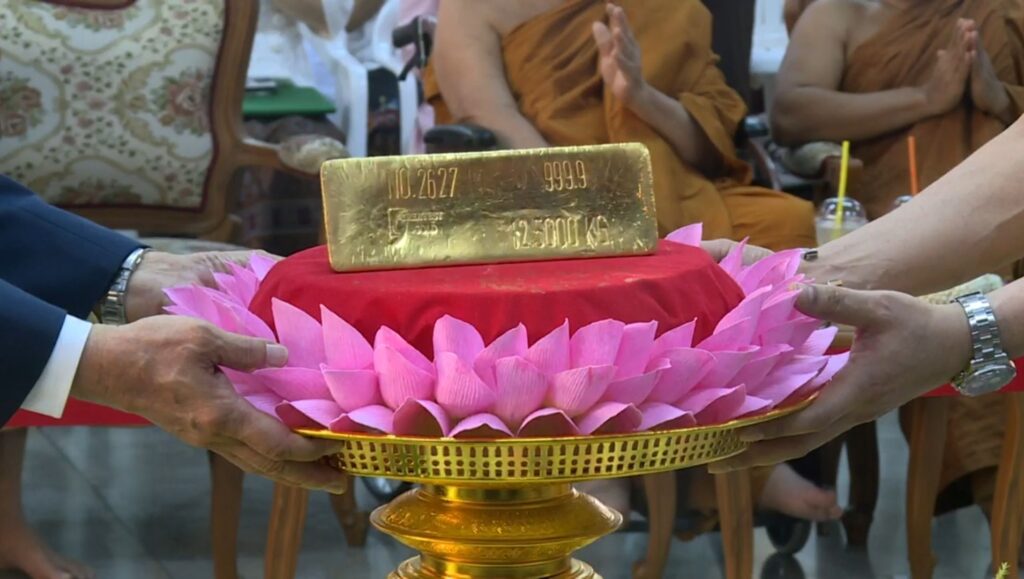 นายเศรษฐพุฒิ สุทธิวาทนฤพุฒิ ผู้ว่าการธนาคารแห่งประเทศไทย (ธปท.) รับมอบทองคำจำนวน 12.5 กิโลกรัม จากการจัดงานบุญประเพณี “ผ้าป่า 12 เมษาฯ สืบหน่อต่อแขนงคลังหลวง บูชาพระคุณองค์หลวงตาพระมหาบัว ญาณสัมปันโน” ครั้งที่ 13 ประจำปี 2567 ตามเจตนารมณ์ของหลวงตาพระมหาบัว ญาณสัมปันโน เพื่อสมทบเข้าเป็นทุนสำรองเงินตรา ณ สวนแสงธรรม พุทธมณฑลสาย 3 โดยมี ศิษยานุศิษย์ของหลวงตาบัวนำดอกไม้มามอบให้กำลังใจแก่ผู้ว่าฯ ธปท.ด้วย