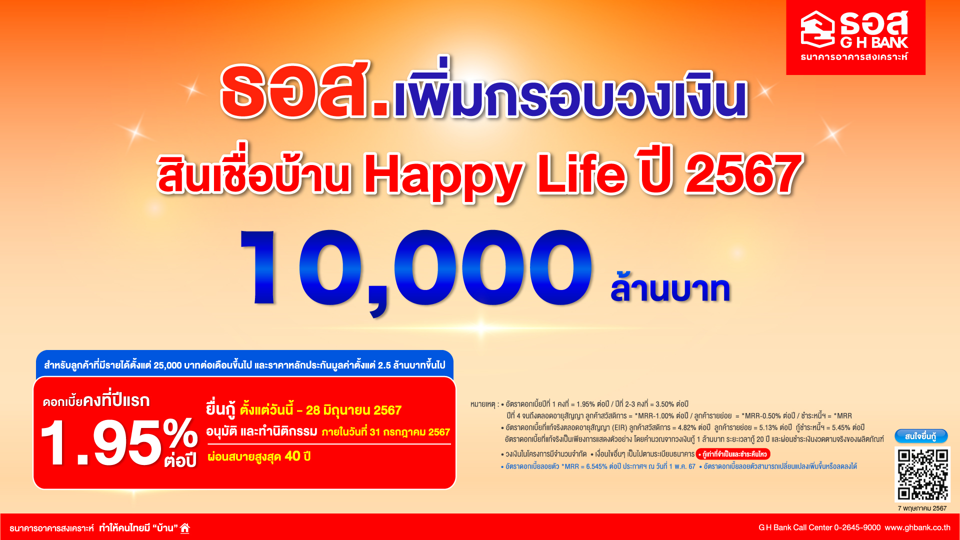 นายกมลภพ วีระพละ กรรมการผู้จัดการ ธนาคารอาคารสงเคราะห์ (ธอส.) เปิดเผยว่า หลังจากที่ธนาคารจัดทำสินเชื่อบ้าน Happy Life ปี 2567 กรอบวงเงิน 10,000 ล้านบาท สำหรับการซื้อที่อยู่อาศัยที่มีราคาตั้งแต่ 2.5 ล้านบาทขึ้นไป โดยจะได้รับอัตราดอกเบี้ยปีที่ 1 คงที่เท่ากับ 1.95% ต่อปี, ปีที่ 2-3 คงที่เท่ากับ 3.50% ต่อปี (อัตราดอกเบี้ยเฉลี่ย 3 ปีแรกเท่ากับ 2.98% เท่านั้น) และปีที่ 4 จนถึงตลอดอายุสัญญา กรณีลูกค้าสวัสดิการ เท่ากับ MRR-1.00% ต่อปี , ลูกค้ารายย่อย เท่ากับ MRR-0.50% ต่อปี และกรณีชำระหนี้ฯ เท่ากับ MRR ต่อปี (อัตราดอกเบี้ย MRR ธอส. ปัจจุบัน เท่ากับ 6.545% ต่อปี) ระยะเวลาการกู้นานสูงสุด 40 ปี เงินงวดปีแรกเพียงล้านละ 3,500 บาทต่อเดือน เท่านั้น! โดย ณ วันที่ 2 พฤษภาคม 2567 มีลูกค้ายื่นขอสินเชื่อดังกล่าวจำนวน 11,228 ล้านบาท เกินกรอบวงเงินที่กำหนด 10,000 ล้านบาทแล้ว สะท้อนว่าลูกค้าให้ความสนใจเป็นจำนวนมาก ดังนั้น เพื่อเป็นการสานต่อนโยบายรัฐบาลของนายเศรษฐา ทวีสิน นายกรัฐมนตรี และนายกฤษฏา จีนะวิจารณะ รัฐมนตรีช่วยว่าการกระทรวงการคลัง ในการส่งเสริมให้คนไทยได้มีที่อยู่อาศัยเป็นของตนเอง และยกระดับ คุณภาพชีวิตของประชาชนให้ดีขึ้น ธอส.จึงปรับเพิ่มกรอบวงเงินสินเชื่อบ้าน Happy Life ปี 2567 อีก 10,000 ล้านบาท เป็น 20,000 ล้านบาท เพื่อรองรับความต้องการของลูกค้าอย่างต่อเนื่อง
