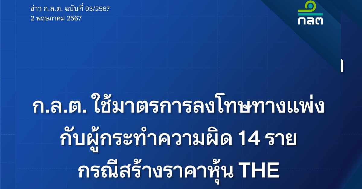 กรุงเทพฯ 2 พ.ค. – สำนักงานคณะกรรมการกำกับหลักทรัพย์และตลาดหลักทรัพย์ (ก.ล.ต.) ดำเนินคดีด้วยมาตรการลงโทษทางแพ่งกับผู้กระทำความผิดรวม 14 ราย กรณีสร้างราคาหุ้น บมจ. เดอะ สตีล (THE) ช่วงปี 58 โดยเรียกให้ชำระเงินตามมาตรการลงโทษทางแพ่งรวม 275,874,196.83 บาท กำหนดระยะเวลาห้ามซื้อขายหลักทรัพย์และสัญญาซื้อขายล่วงหน้า และห้ามเป็นกรรมการหรือผู้บริหาร