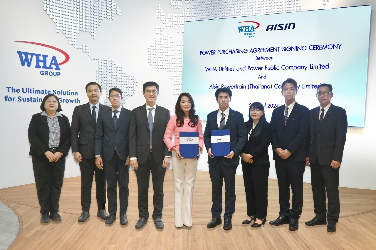 นางสาวจรีพร จารุกรสกุล ประธานคณะกรรมการบริหาร และประธานเจ้าหน้าที่บริหารกลุ่ม บมจ.ดับบลิวเอชเอ คอร์ปอเรชั่น (WHA Group) เป็นประธานในพิธีลงนามสัญญาซื้อขายไฟฟ้าพลังงานแสงอาทิตย์ (Power Purchasing Agreement: PPA) ในโครงการ Aisin Powertrain Solar เฟส 2 โดยมีนายสมเกียรติ เมสันธสุวรรณ ประธานเจ้าหน้าที่บริหาร บมจ.ดับบลิวเอชเอ ยูทิลิตี้ส์ แอนด์ พาวเวอร์ (WHAUP) และนายมาสะฮิโระ คาเมอิ ประธานกรรมการ บริษัท ไอซิน พาวเวอร์ เทรน (ประเทศไทย) จำกัด (AIPT) ร่วมลงนามสัญญาฯ ณ WHA Tower