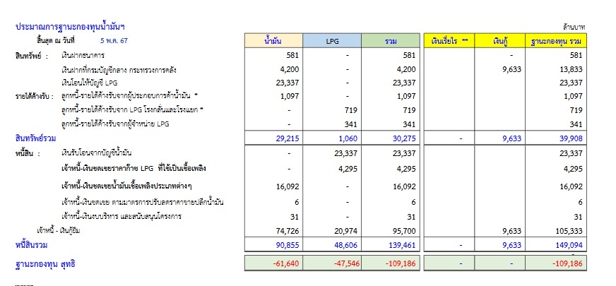 ล่าสุดฐานะ กองทุนน้ำมันฯ วันที่ 5 พ.ค.67ติดลบ 109,186 ล้านบาท แยกเป็น บัญชีน้ำมันติดลบ 61,640 ล้านบาทและกองทุนอุดหนุนแอลพีจี 47,546 ล้านบาท โดยอัตราภาษีดีเซลบี 7 จัดเก็บที่ 5.99 บาท/ลิตร และกองทุนฯอุดหนุนดีเซล ลิตรละ 3.58 บาท หรือราว 250 ล้านบาท/วัน หรือกว่า 7,500 ล้านบาทต่อเดือน การทยอยขึ้นราคาดีเซล ก็จะช่วยลดการอุดหนุนและเพิ่มสภาพคล่องแก่กองทุนฯ โดยกองทุนฯ ล่าสุดยังมีหนี้กว่า1 แสนล้านบาทในการกู้ยืมเงินมาอุดหนุนราคาเชื้อเพลิง.-511-สำนักข่าวไทย