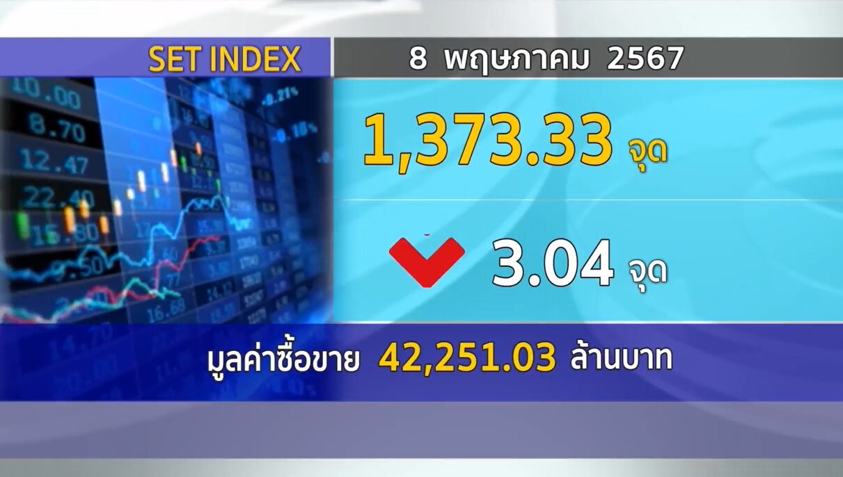 กทม. 8 พ.ค.-SET ปิดวันนี้ที่ 1,373.33 จุด ลดลง 3.04 จุด (-0.22%) มูลค่าการซื้อขาย 42,288.84 ล้านบาท
