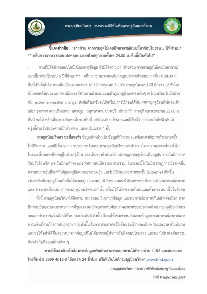 กรมอุตุนิยมวิทยา ขอชี้แจงว่า ข้อมูลดังกล่าวเป็นข้อมูลที่มีการเผยแพร่และส่งต่อมาแล้วหลายครั้ง ในปีที่ผ่านมา และมิได้มาจากการประกาศเตือนของกรมอุตุนิยมวิทยาแต่ประการใด สภาพอากาศโดยทั่วไปในขณะนี้ประเทศไทยอยู่ในช่วงฤดูร้อน และเป็นช่วงกำลังเปลี่ยนถ่ายฤดูจากฤดูร้อนเป็นฤดูฝน บางวันมีอากาศร้อนถึงร้อนจัด บางวันมีฝนฟ้าคะนอง ทิศทางลมมีความแปรปรวน ในระยะนี้ยังไม่มีปรากฏการณ์ของคลื่นความหนาวเย็นที่จะทำให้อุณหภูมิลดลงอย่างรวดเร็ว และไม่มีลักษณะอากาศสุดขั้ว (Extreme) เกิดขึ้น เว้นแต่ยังมีพายุฤดูร้อนเกิดขึ้นได้ตามฤดูกาลตามปกติ จึงขอแนะนำให้ประชาชน ติดตามข่าวพยากรณ์อากาศและประกาศเตือนภัยจากกรมอุตุนิยมวิทยาเท่านั้น เพื่อมิให้เกิดความสับสนและตื่นตระหนกขึ้นในสังคม