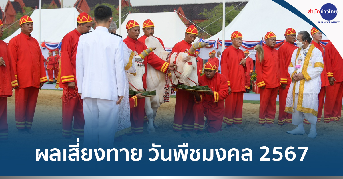 กรุงเทพฯ 10 พ.ค. – พระราชพิธีพืชมงคลจรดพระนังคัลแรกนาขวัญ ปีพุทธศักราช 2567 ทำขวัญพืชพันธุ์ธัญญาหาร เริ่มฤดูกาลเพาะปลูก พระยาแรกนาได้เสี่ยงทายหยิบผ้าได้ 5 คืบ พยากรณ์ว่า น้ำในปีนี้จะมีปริมาณพอดี ข้าวกล้าในนา จะได้ผลบริบูรณ์ และผลาหาร มังสาหาร จะอุดมสมบูรณ์ดี และพระโคกินน้ำ หญ้า และเหล้า น้ำท่าจะบริบูรณ์พอสมควร ธัญญาหาร ผลาหาร ภักษาหาร มังสาหาร จะอุดมสมบูรณ์ดี การคมนาคมสะดวกขึ้น การค้าขายกับต่างประเทศดีขึ้น ทำให้เศรษฐกิจรุ่งเรือง