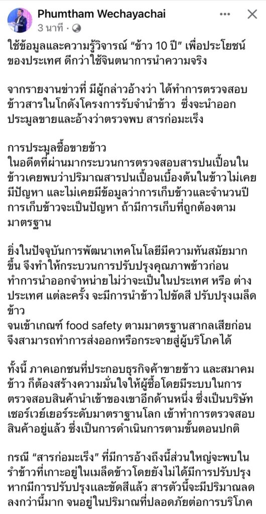 ผู้สื่อข่าวรายงานนายภูมิธรรม เวชยชัย รองนายกรัฐมนตรีและรัฐมนตรีว่าการกระทรวงพาณิชย์ออกมาโต้นักวิชาการและนักการเมืองบางท่านที่มาวิจารณ์ “ข้าว 10 ปี” ตรวจพบสารก่อมะเร็งไม่ควรประมูลซื้อขายข้าวทางเฟซบุ๊กส่วนตัวว่า ใช้ข้อมูลและความรู้วิจารณ์ “ข้าว 10 ปี” เพื่อประโยชน์ของประเทศ ดีกว่าใช้จินตนาการนำความจริง จากรายงานข่าวที่ มีผู้กล่าวอ้างว่า ได้ทำการตรวจสอบข้าวสารในโกดังโครงการรับจำนำข้าว ซึ่งจะนำออกประมูลขายและอ้างว่าตรวจพบ สารก่อมะเร็งการประมูลซื้อขายข้าว