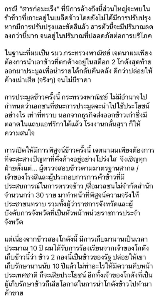 กรณี “สารก่อมะเร็ง” ที่มีการอ้างถึงนี้ส่วนใหญ่จะพบในรำข้าวที่เกาะอยู่ในเมล็ดข้าวโดยยังไม่ได้มีการปรับปรุง หากมีการปรับปรุงและขัดสีแล้ว สารตัวนี้จะมีปริมาณลดลงกว่านี้มาก จนอยู่ในปริมาณที่ปลอดภัยต่อการบริโภค ในฐานะที่ผมเป็น รมว.กระทรวงพาณิชย์ เจตนาผมเพียงต้องการนำเอาข้าวที่ตกค้างอยู่ในสต็อก 2 โกดังสุดท้ายออกมาประมูลเพื่อนำรายได้กลับคืนคลัง ดีกว่าปล่อยให้ค้างเน่าเสีย (จริงๆ) จนไม่มีราคาการประมูลข้าวครั้งนี้ กระทรวงพาณิชย์ ไม่มีอำนาจไปกำหนดว่าเอกชนที่ชนะการประมูลจะนำไปใช้ประโยชน์