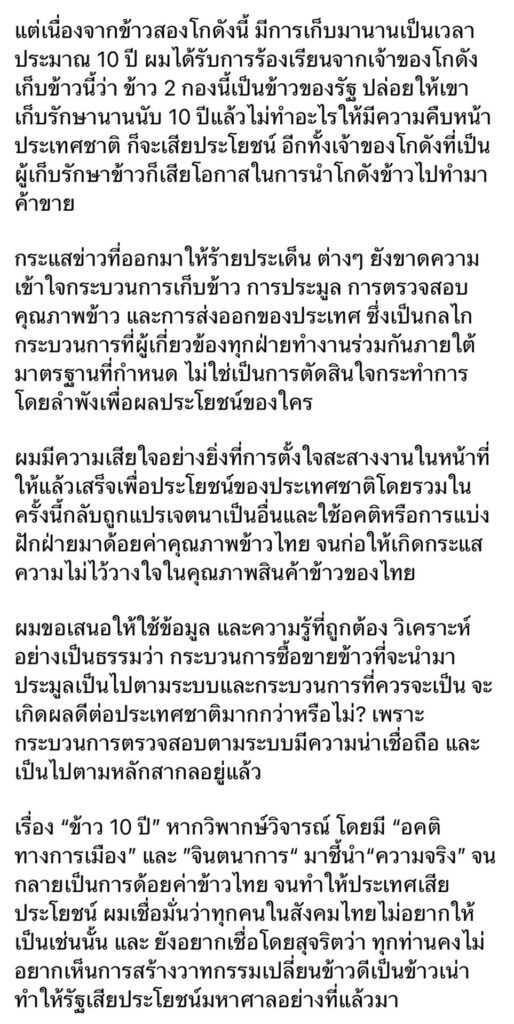 กระแสข่าวที่ออกมาให้ร้ายประเด็น ต่างๆ ยังขาดความเข้าใจกระบวนการเก็บข้าว การประมูล การตรวจสอบคุณภาพข้าว และการส่งออกของประเทศ ซึ่งเป็นกลไกกระบวนการที่ผู้เกี่ยวข้องทุกฝ่ายทำงานร่วมกันภายใต้มาตรฐานที่กำหนด ไม่ใช่เป็นการตัดสินใจกระทำการโดยลำพังเพื่อผลประโยชน์ของใคร ผมมีความเสียใจอย่างยิ่งที่การตั้งใจสะสางงานในหน้าที่ให้แล้วเสร็จเพื่อประโยชน์ของประเทศชาติโดยรวมในครั้งนี้กลับถูกแปรเจตนาเป็นอื่นและใช้อคติหรือการแบ่งฝักฝ่ายมาด้อยค่าคุณภาพข้าวไทย จนก่อให้เกิดกระแสความไม่ไว้วางใจในคุณภาพสินค้าข้าวของไทย