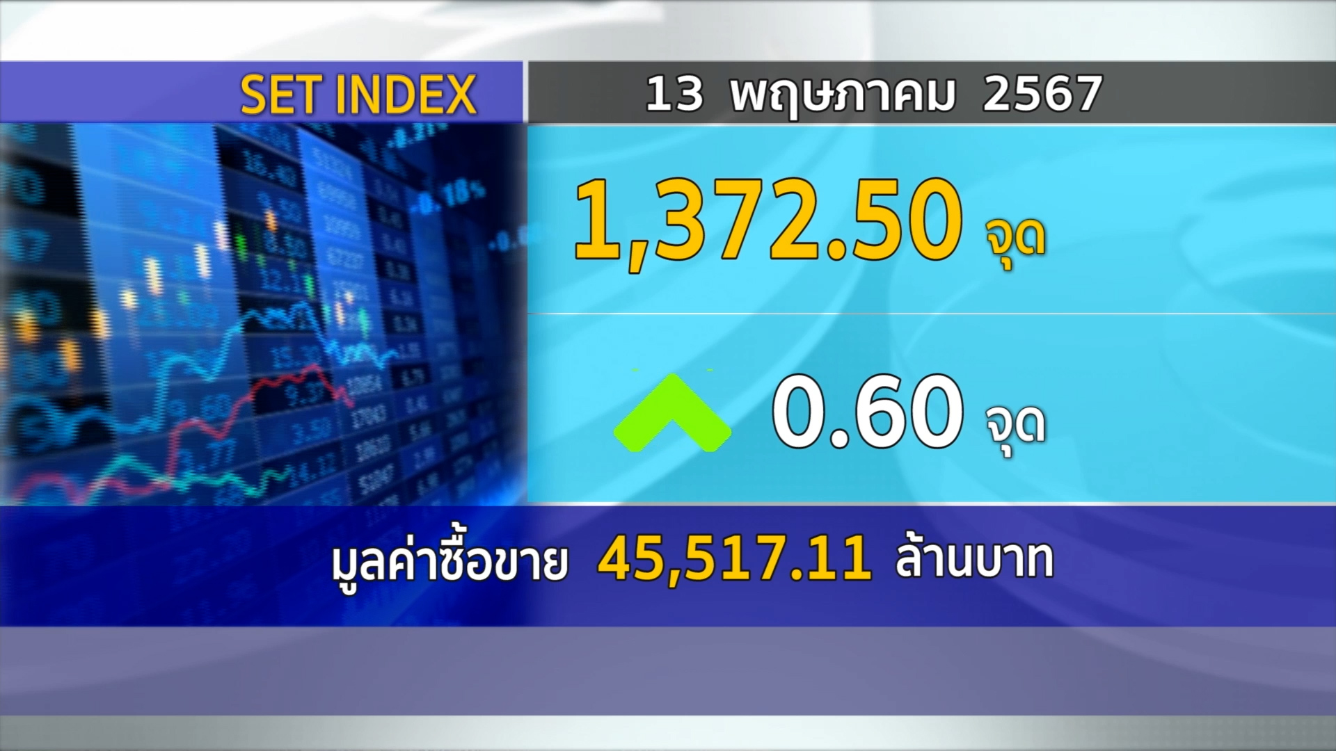 กทม. 13 พ.ค.- SET ปิดวันนี้ที่ 1,372.50 จุด เพิ่มขึ้น 0.60 จุด (+0.04%) มูลค่าซื้อขาย 45,517.11 ล้านบาท