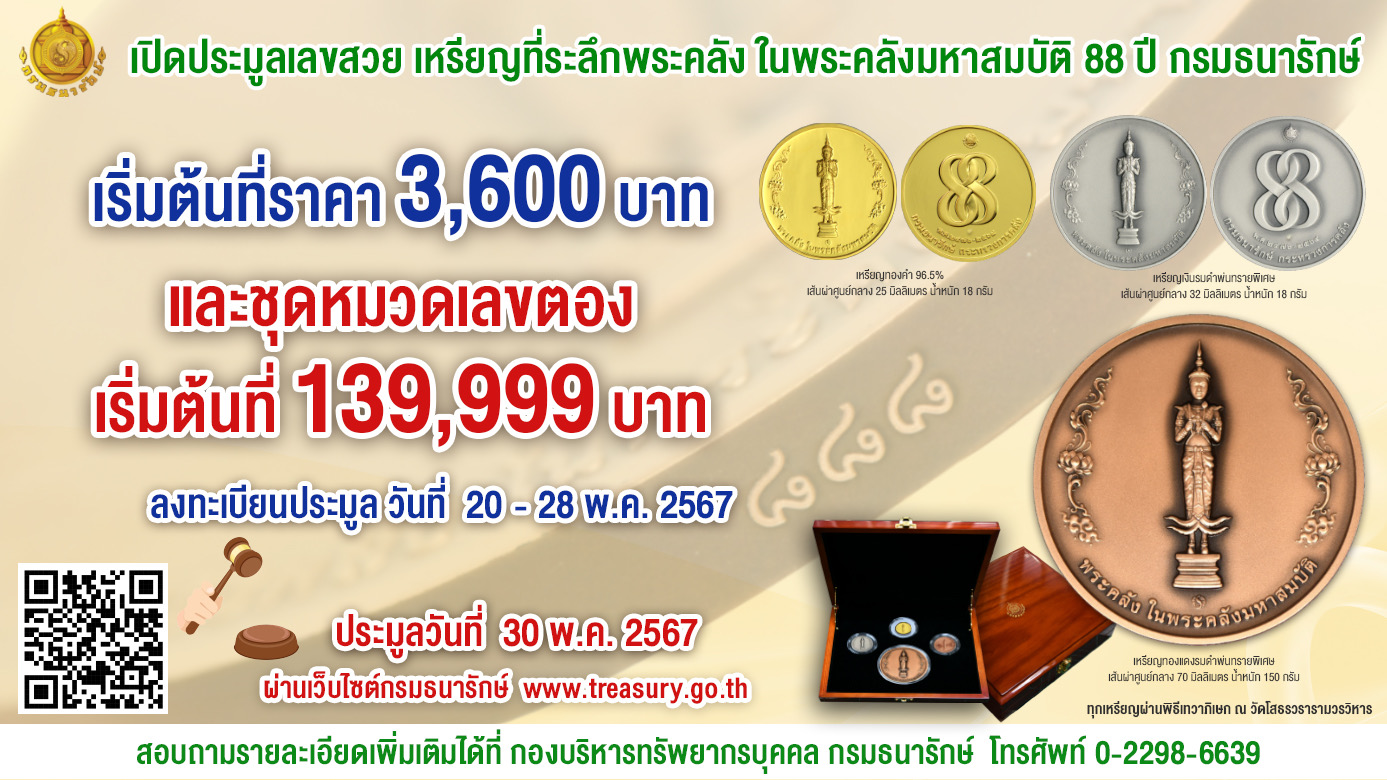 กรุงเทพฯ 15 พ.ค.-กรมธนารักษ์เปิดประมูลเหรียญที่ระลึก พระคลังในพระคลังมหาสมบัติ 88 ปี ด้วยวิธีประมูลอิเล็กทรอนิกส์ 30 พฤษภาคม 2567 คัดเลขสวยพิเศษ เลข 8 เลข 9 เลข 99 และเลขตอง 888