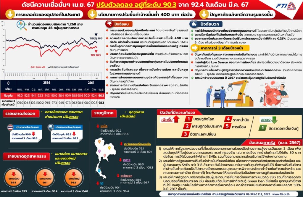 นายเกรียงไกร เธียรนุกุล ประธานสภาอุตสาหกรรมแห่งประเทศไทย (ส.อ.ท.)เปิดเผยผลสำรวจดัชนีความเชื่อมั่นภาคอุตสาหกรรมในเดือนเมษายน 2567 อยู่ที่ระดับ 90.3 ปรับตัวลดลงจาก 92.4 ในเดือนมีนาคม 2567 โดยเป็นการปรับตัวลดลงทุกองค์ประกอบ ทั้งยอดขายโดยรวม คำสั่งซื้อโดยรวม ปริมาณการผลิต ต้นทุนประกอบการและผลประกอบการ ทั้งนี้ความเชื่อมั่นภาคอุตสาหกรรมที่ปรับตัวลดลงเป็นผลมาจากการชะลอตัวของอุปสงค์ในประเทศ อาทิ สินค้ายานยนต์ เฟอร์นิเจอร์ สิ่งทอ เครื่องนุ่งห่ม เนื่องจากสภาวะเศรษฐกิจมีความไม่แน่นอน ส่งผลให้ประชาชนระมัดระวังการใช้จ่าย ผู้ประกอบการโดยเฉพาะ SMEs มีความกังวลต่อนโยบายการปรับขึ้นค่าจ้างขั้นต่ำ 400 บาทต่อวันเท่ากันทั่วประเทศ ซึ่งจะกระทบต่อต้นทุนการผลิต