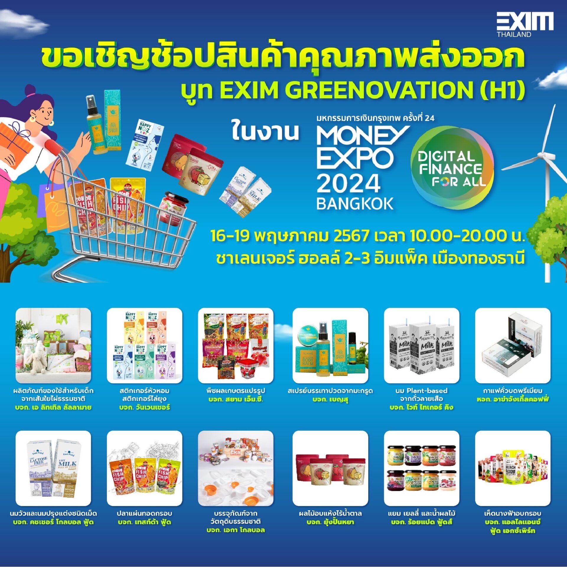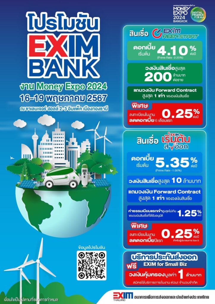 ธนาคารเพื่อส่งออกและนำเข้าแห่งประเทศไทย (EXIM BANK) จัดเต็ม! บริการทางการเงินและโปรโมชันพิเศษครบครัน ในงาน “มหกรรมการเงินกรุงเทพ ครั้งที่ 24 (Money Expo 2024)” ระหว่างวันพฤหัสบดีที่ 16-วันอาทิตย์ที่ 19 พฤษภาคม 2567 ณ ชาเลนเจอร์ ฮอลล์ 2-3 อิมแพ็ค เมืองทองธานี หมายเลขบูท H1 ชูแนวคิด “EXIM Greenovation” รับกระแส Go Green ของผู้ประกอบการ SMEs และบุคคลทำธุรกิจที่สนใจเริ่มต้นหรือขยายธุรกิจส่งออก โดยเฉพาะธุรกิจที่เป็นมิตรกับสิ่งแวดล้อม ไฮไลต์สุดพิเศษ ประกอบด้วย