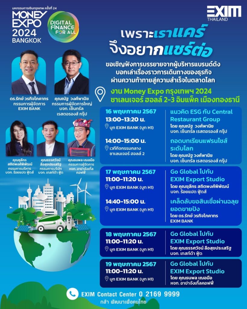 พร้อมรับฟังการบรรยายจากผู้บริหารแบรนด์ดัง บอกเล่าเรื่องราวการเดินทางของธุรกิจผ่านความท้าทายสู่ความสำเร็จในตลาดโลก ตลอด 4 วัน ตามรอบกิจกรรม ทั้งนี้ ดร.รักษ์ วรกิจโภคาทร กรรมการผู้จัดการ EXIM BANK มีกำหนดบรรยายเรื่อง เคล็ดลับขอสินเชื่อผ่านฉลุย ยอดขายปัง ในวันศุกร์ที่ 17 พฤษภาคม 2567 เวลา 14.40-15.00 น. ณ บูท EXIM BANK