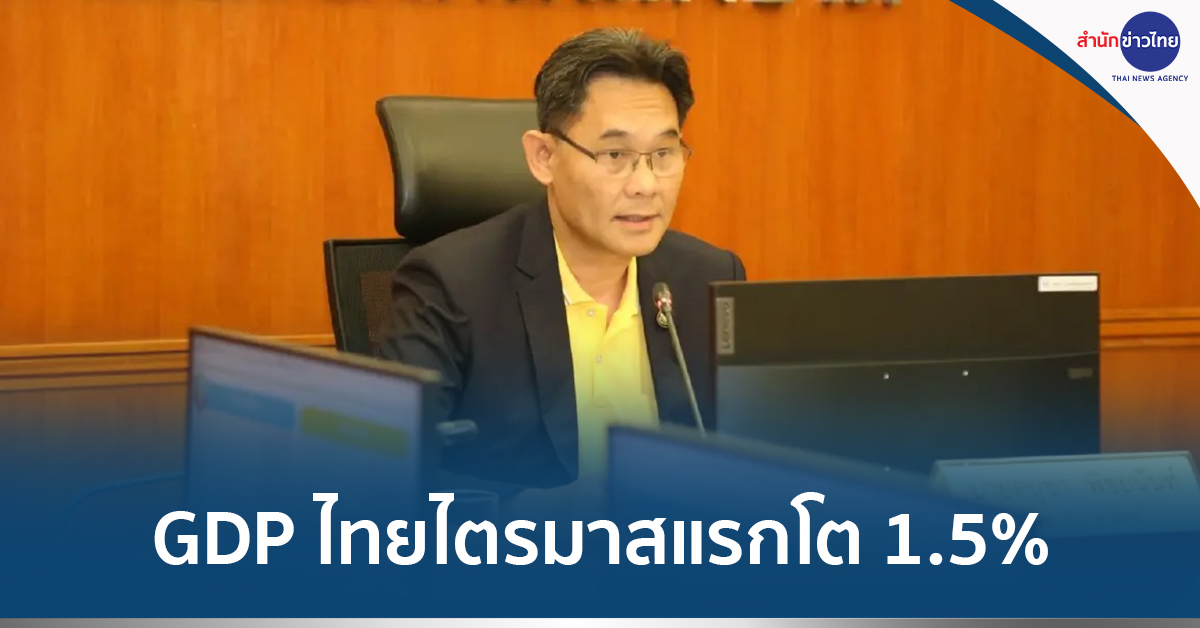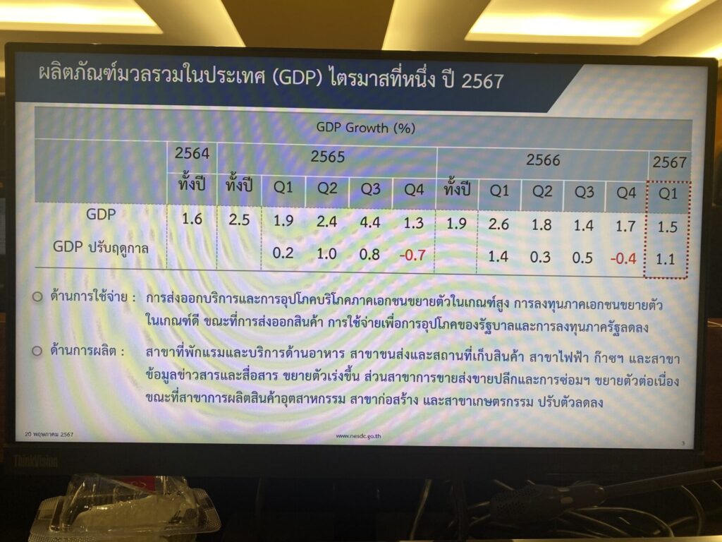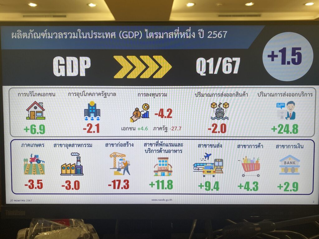กรุงเทพฯ 20 พ.ค.-เลขาธิการสภาพัฒนาการเศรษฐกิจและสังคมแห่งชาติ (สศช.) เผยเศรษฐกิจไทยไตรมาสแรกได้รับแรงหนุนจากบริโภคในประเทศและท่องเที่ยวดันให้ดัน GDP ไทยไตรมาสแรกโต 1.5% แต่จับตาผลผลิตอุตสหกรรมลดและส่งออกเริ่มลง ทำให้ สศช.ปรับลด GDP ทั้งปี 67 ใหม่เหลือเพียงโตแค่ 2-3 %จากเดิม 2.2-3.2 %
