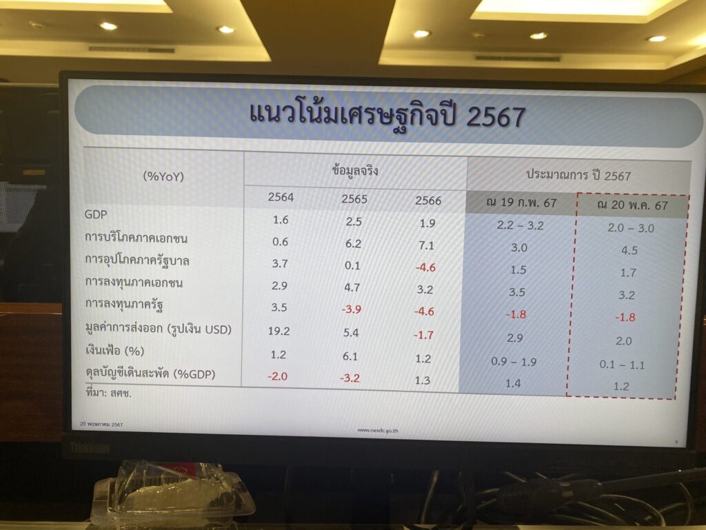 นายดนุชา พิชยนันท์ เลขาธิการ สภาพัฒนาการเศรษฐกิจและสังคมแห่งชาติ (สศช.) กล่าวถึงภาวะเศรษฐกิจไทยไตรมาสแรกของปี 2567 และแนวโน้มปี 2567 ว่า แม้ GDP ไทยในช่วงไตรมาส 1/2567 ขยายตัวถึง 1.5% จากแรงส่งการบริโภคในประเทศสูงและการท่องเที่ยวเพิ่มขึ้นต่อเนื่อง แต่ในช่วงหลังจากนี้ไปยังมีหลายปัจจัย โดยเฉพาะผลผลิตภาคอุตสาหกรรมมีแนวโน้นลดลงรวมถึงภาคการส่งออกของไทยเริ่มชะลอตัวลง ทำให้ สศช.ปรับลดคาดการณ์ผลิตภัณฑ์มวลรวมภายในประเทศ หรือ GDP ของไทยปี 2567ใหม่ โดยคาดว่าจะขยายตัว 2.0 – 3.0 % จากเดิมอยู่ที่จากเดิม 2.2-3.2 % โดยมี(ค่ากลางการประมาณการ 2.5 % ) แต่ถือยังดีกว่าปี 66 ที่โตเพียง 1.9 % ซึ่งมีปัจจัยสนับสนุนสำคัญจาก การเร่งตัวขึ้นของการใช้จ่ายและการลงทุนภาครัฐ การฟื้นตัวของภาคการท่องเที่ยวและภาคบริการที่เกี่ยวเนื่อง การขยายตัวในเกณฑ์ดีของอุปสงค์ภายในประเทศทั้งการอุปโภคบริโภคและการลงทุน และการกลับมาขยายตัวอย่างช้า ๆ ของการส่งออกสินค้าตามการฟื้นตัวของการค้าโลก การอุปโภคบริโภคและการลงทุนภาคเอกชนขยายตัว 4.5% และ 3.2 % ตามลำดับ มูลค่าการส่งออก สินค้าในรูปดอลลาร์ สรอ. ขยายตัว 2.0 % อัตราเงินเฟ้อคาดว่าจะอยู่ในช่วง 0.1 – 1.1 % และดุลบัญชีเดินสะพัดเกินดุล 1.2 %