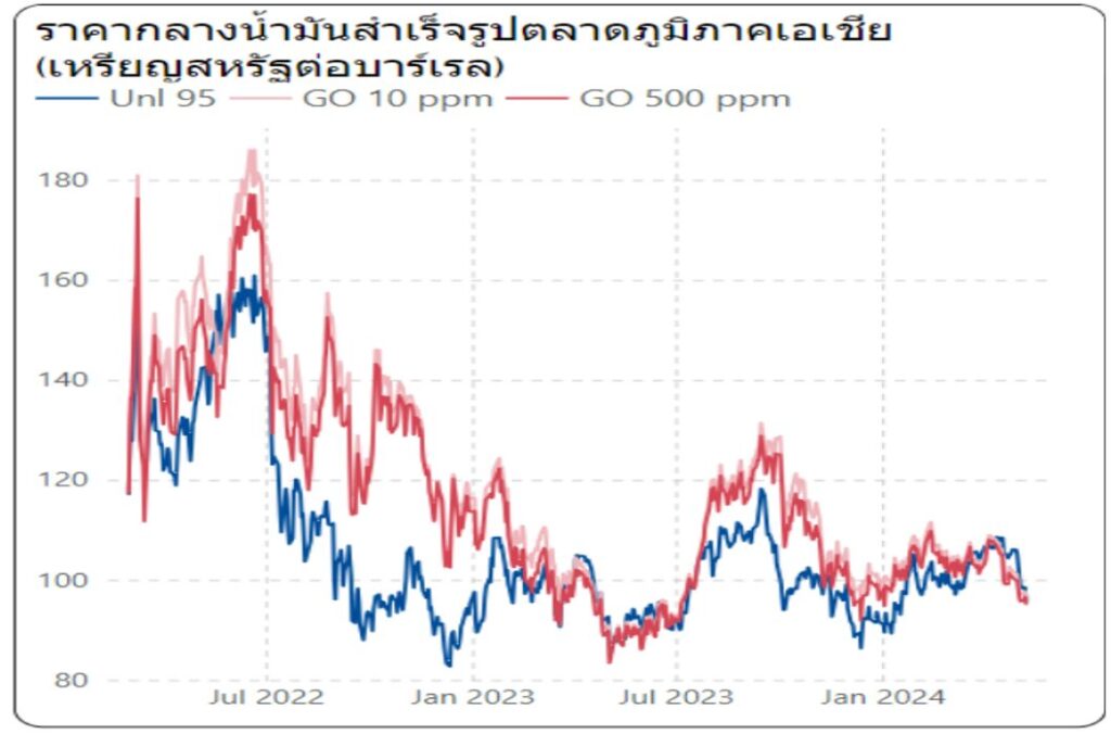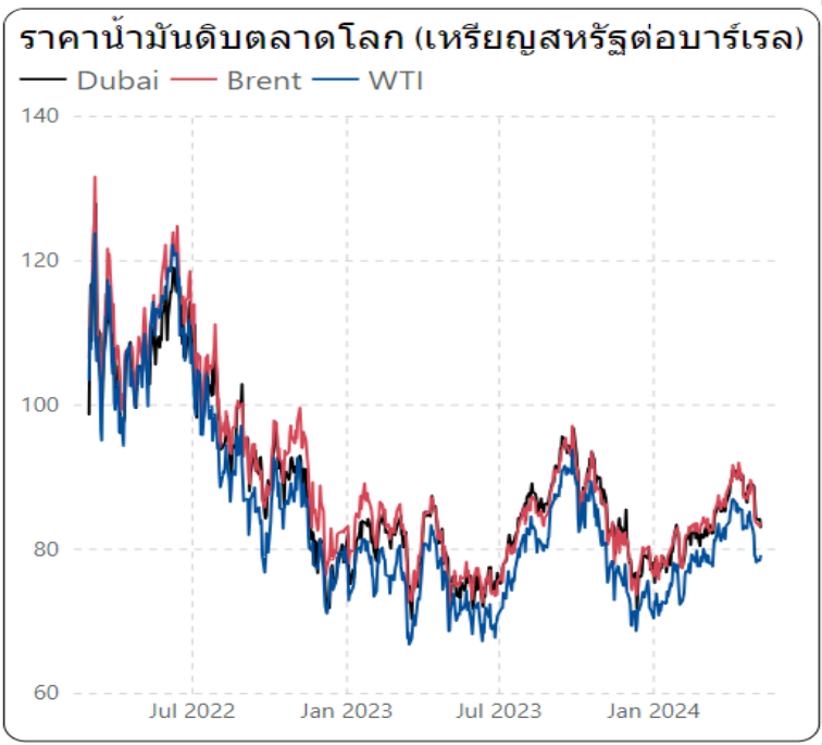 ส่วนสถานการณ์ราคาน้ำมันเชื้อเพลิงในตลาดโลก พบว่า ราคาน้ำมันดิบยังคงผันผวน จากสถานการณ์ความขัดแย้งทางภูมิศาสตร์ในภูมิภาคตะวันออกกลางที่ยังรุนแรง อีกทั้งตลาดคาดการณ์ว่า ในการประชุมกำหนดโควต้าการผลิตในวันที่ 1 มิถุนายน 2567 กลุ่มโอเปกพลัสมีแนวโน้มจะขยายเวลาการลดกำลังการผลิตไปถึงสิ้นไตรมาส 3/67 ซึ่งภาพรวมสถานการณ์ราคาน้ำมันโลก (ระหว่างวันที่ 6 – 12 พฤษภาคม 2567) ที่ผ่านมา ราคาน้ำมันดิบดูไบ เฉลี่ยอยู่ที่ระดับ 84.13 เหรียญสหรัฐต่อบาร์เรล ปรับตัวลดลงจากสัปดาห์ที่แล้ว 2.39 เหรียญสหรัฐต่อบาร์เรล ส่วนน้ำมันดิบเวสต์ เท็กซัส เฉลี่ยอยู่ที่ระดับ 78.67 เหรียญสหรัฐต่อบาร์เรล ปรับตัวลดลงจากสัปดาห์ที่แล้ว 1.45 เหรียญสหรัฐต่อบาร์เรล ด้านราคากลางน้ำมันสำเร็จรูปตลาดภูมิภาคเอเชีย ราคาน้ำมันเบนซินออกเทน 95 เฉลี่ยอยู่ที่ระดับ 97.29 เหรียญสหรัฐต่อบาร์เรล ปรับตัวลดลงจากสัปดาห์ที่แล้ว 2.32 เหรียญสหรัฐต่อบาร์เรล ส่วนราคาน้ำมันดีเซลหมุนเร็ว (10 PPM) เฉลี่ยอยู่ที่ระดับ 97.83 เหรียญสหรัฐต่อบาร์เรล ปรับตัวลดลงจากสัปดาห์ที่แล้ว 1.52 เหรียญสหรัฐต่อบาร์เรล