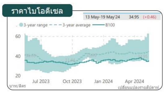 นายวีรพัฒน์ เกียรติเฟื่องฟู ผู้อำนวยการสำนักงานนโยบายและแผนพลังงาน (สนพ.) เปิดเผยว่า จากการติดตามสถานการณ์ราคาน้ำมันเชื้อเพลิงชีวภาพไทย พบว่า ราคาน้ำมันไบโอดีเซล อ้างอิงเฉลี่ยระหว่างวันที่ 13 – 19 พฤษภาคม 2567 อยู่ที่ ราคา 34.49 บาทต่อลิตร เพิ่มขึ้นจากสัปดาห์ก่อน 0.46 บาทต่อลิตร จากสถานการณ์ราคาผลปาล์มน้ำมัน ณ วันที่ 6 – 10 พฤษภาคม 2567 เฉลี่ยอยู่ที่ 32.38 บาทต่อกิโลกรัม ขณะนี้ราคาน้ำมันปาล์มดิบมาเลเซีย ราคาเฉลี่ยอยู่ที่ 30.76 บาทต่อกิโลกรัม เพิ่มขึ้นจากสัปดาห์ก่อน 0.25 บาทต่อกิโลกรัม ในส่วนปริมาณสต๊อกน้ำมันมันปาล์มดิบ ณ สิ้นมีนาคม 2567 อยู่ที่ 256,186 ตัน โดยสต็อก B100 อยู่ที่ 60.24 ล้านลิตร ลดลงจากเดือนก่อน 2.05 ล้านลิตร สำหรับราคาเอทานอลของไทยอ้างอิงในเดือนพฤษภาคม 2567 อยู่ที่ 30.65 บาทต่อลิตร ราคาเปลี่ยนแปลงลดลงจากเดือนก่อน 0.53 บาทต่อลิตร