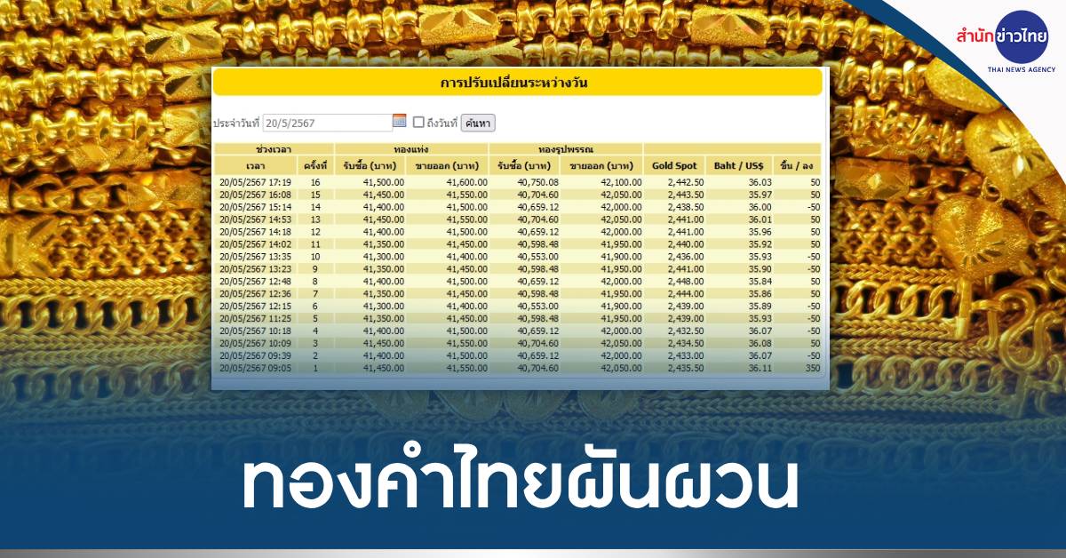 กรุงเทพฯ 20 พ.ค.- สมาคมค้าทองคำ แจ้งทองคำไทยผันผวน วันนี้ปรับเปลี่ยน 16 ครั้ง อุบัติเหตุที่ทำให้ประธานาธิบดีอิหร่านเสียชีวิต ทำให้นักลงทุนเข้าซื้อทองคำในฐานะสินทรัพย์ปลอดภัยเพิ่มมากขึ้น