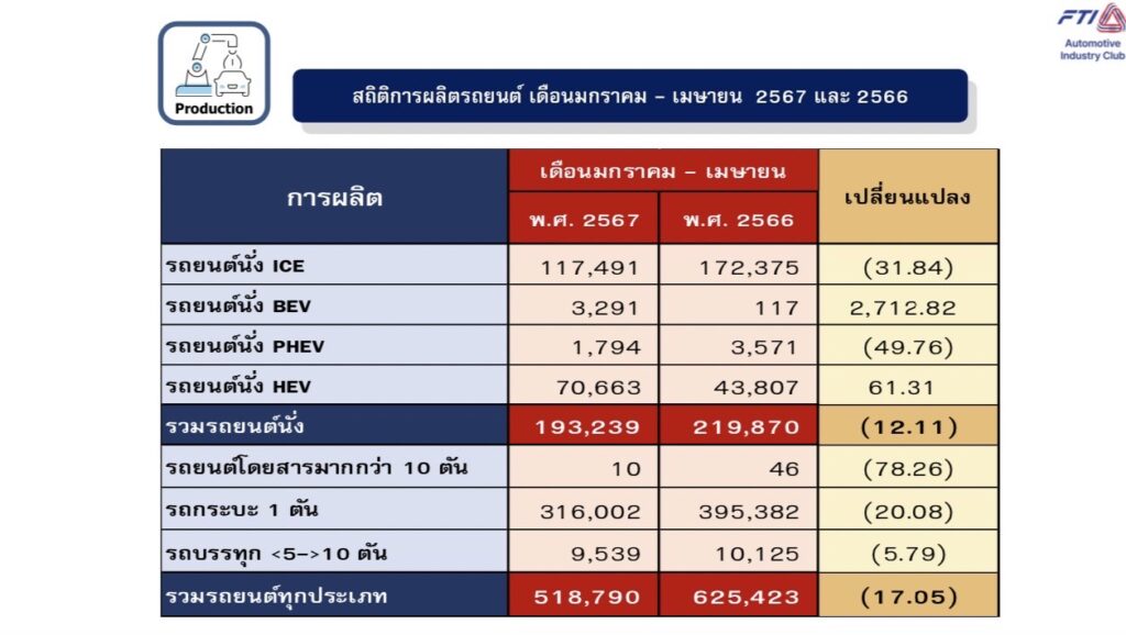 นายสุรพงษ์ ไพสิฐพัฒนพงษ์ ที่ปรึกษาประธานกลุ่มอุตสาหกรรมยานยนต์และโฆษกกลุ่มอุตสาหกรรมยานยนต์ สภาอุตสาหกรรมแห่งประเทศไทย (ส.อ.ท.) เปิดเผยว่า เดือนเมษายน 2567 ผลิตรถยนต์ทั้งสิ้น 104,667 คัน ลดลงจากเดือนเมษายน 2566 ที่ 11.02% จากการผลิตรถยนต์นั่งและรถกระบะเพื่อขายในประเทศที่ลดลง 5.03% และ 45.94% ตามลำดับสอดคล้องกับยอดขายที่ลดลง เพราะหนี้ครัวเรือนที่สูงและเศรษฐกิจเติบโตในอัตราต่ำ ดัชนีผลผลิตอุตสาหกรรมติดลมมาหลายเดือน กำลังซื้อยังเปราะบาง และลดลงจากเดือนมีนาคม 2567 ที่ 24.34%