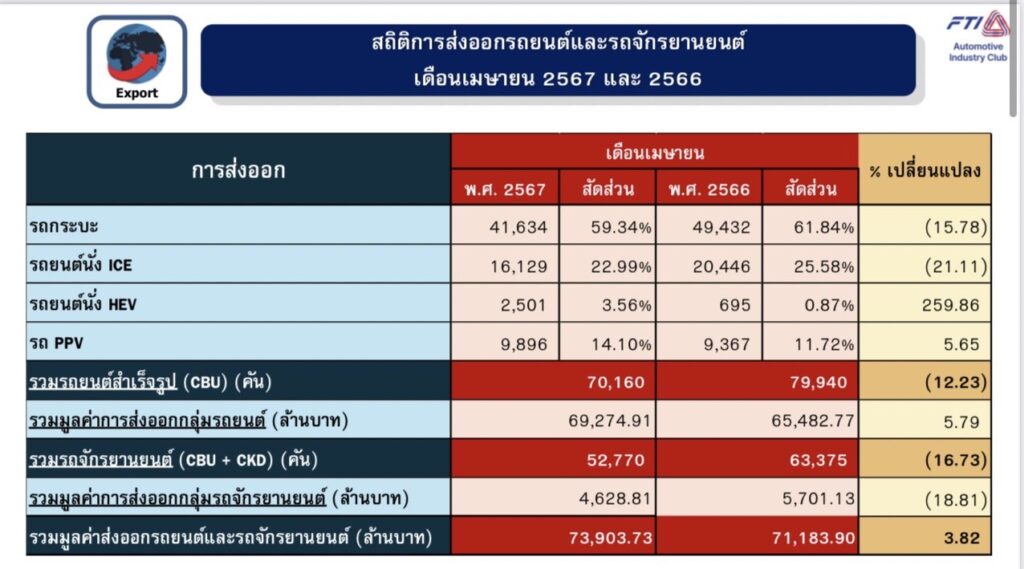 ในขณะที่การผลิตเพื่อส่งออกเดือนเมษายน 2567 ผลิตได้ 71,928 คัน เท่ากับ 68.72% ของยอดการผลิตทั้งหมด เพิ่มขึ้นจากเดือนเมษายน 2566 ที่ 5.92% ส่วนเดือนมกราคม – เมษายน 2567 ผลิตเพื่อส่งออกได้ 345,608 คัน เท่ากับ 66.62% ของยอดการผลิตทั้งหมด ลดลงจากปี 2566 ระยะเวลาเดียวกัน 2.93%