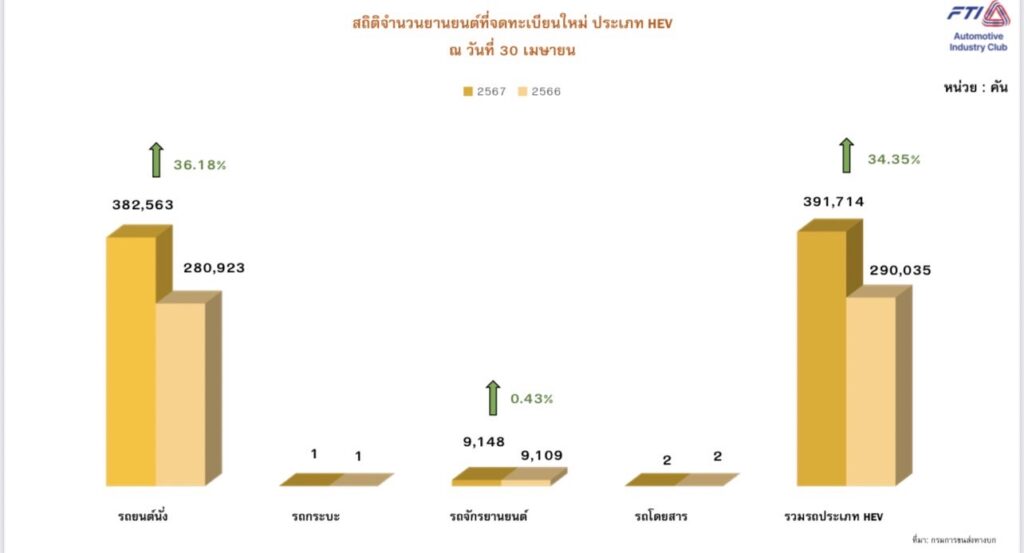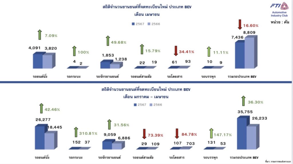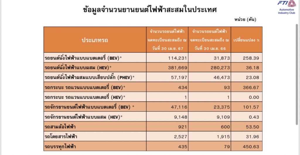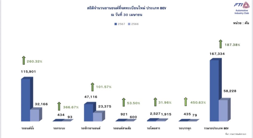 ส่วนยานยนต์ไฟฟ้าจดทะเบียนสะสมประเภท BEV ณ วันที่ 30 เมษายน 2567 มีจำนวนทั้งสิ้น 167,334 คัน เพิ่มขึ้นจากปีที่แล้ว 187.38% ในขณะที่ ณ วันที่ 30 เมษายน 2567 มีจำนวนทั้งสิ้น 391,714 คัน เพิ่มขึ้นจากปีที่แล้ว 35.06%