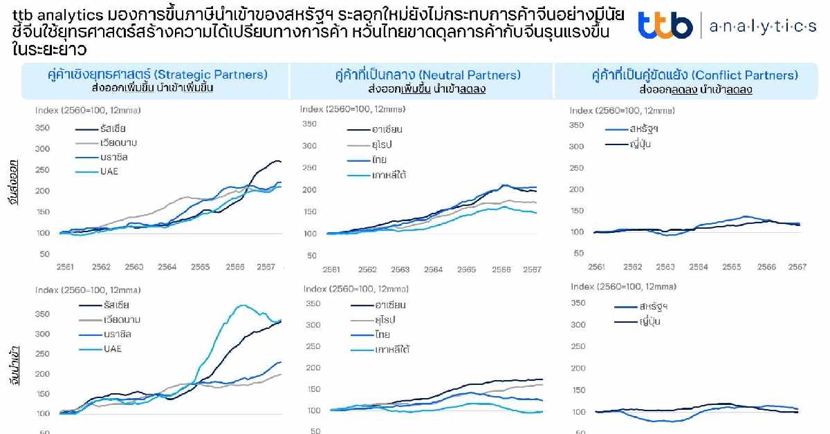 กรุงเทพฯ 23 พ.ค.- ttb analytics มองการขึ้นภาษีนำเข้าของสหรัฐฯ ระลอกใหม่ยังไม่กระทบการค้าจีนอย่างมีนัย ชี้จีนใช้ยุทธศาสตร์สร้างความได้เปรียบทางการค้า หวั่นไทยขาดดุลการค้ากับจีนรุนแรงขึ้นในระยะยาว