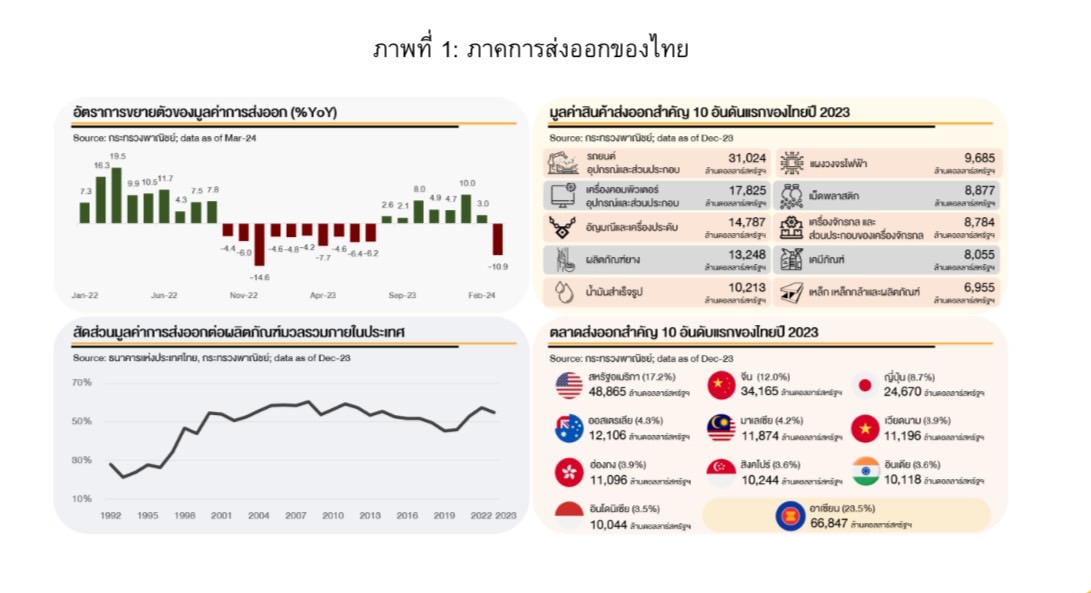 ตลาดหลักทรัพย์แห่งประเทศไทย (ตลท.) เผยแพร่ SET Note ฉบับที่ 4/2567 “Theme การลงทุนในบริษัทที่มีรายได้จากต่างประเทศ (SET-Global Play)” โดยระบุว่าการส่งออกของไทยถือเป็นส่วนสำคัญต่อการเจริญเติบโตทางเศรษฐกิจของประเทศมาโดยตลอด และเริ่มเห็นสัญญาณการฟื้นตัวอย่างต่อเนื่อง โดยขยายตัวได้ 3.6% ในเดือนกุมภาพันธ์ ต่อเนื่องเป็นเดือนที่ 7 ก่อนเริ่มมีสัญญาณชะลอตัวจากการหดตัวของการส่งออกในเดือนมีนาคมเมื่อเทียบกับฐานที่สูงในช่วงเดียวกันของปีก่อน (%YoY)