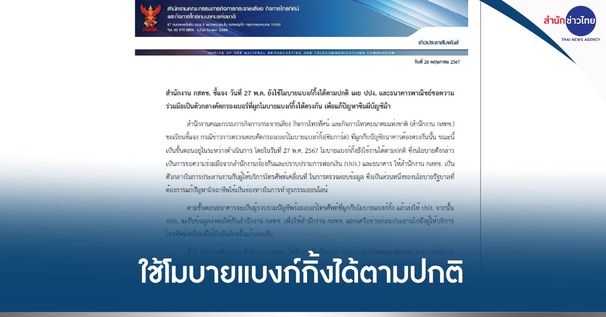 สำนักงานคณะกรรมการกิจการกระจายเสียง กิจการโทรทัศน์ และกิจการโทรคมนาคมแห่งชาติ (สำนักงาน กสทช.) ขอเรียนชี้แจง กรณีข่าวการตรวจสอบคัดกรองเบอร์โมบายแบงก์กิ้ง(ซิมการ์ด) ที่ผูกกับบัญชีธนาคารต้องตรงกันนั้น ขณะนี้เป็นขั้นตอนอยู่ในระหว่างดำเนินการ โดยในวันที่ 27 พ.ค. 2567 โมบายแบงก์กิ้งยังใช้งานได้ตามปกติ