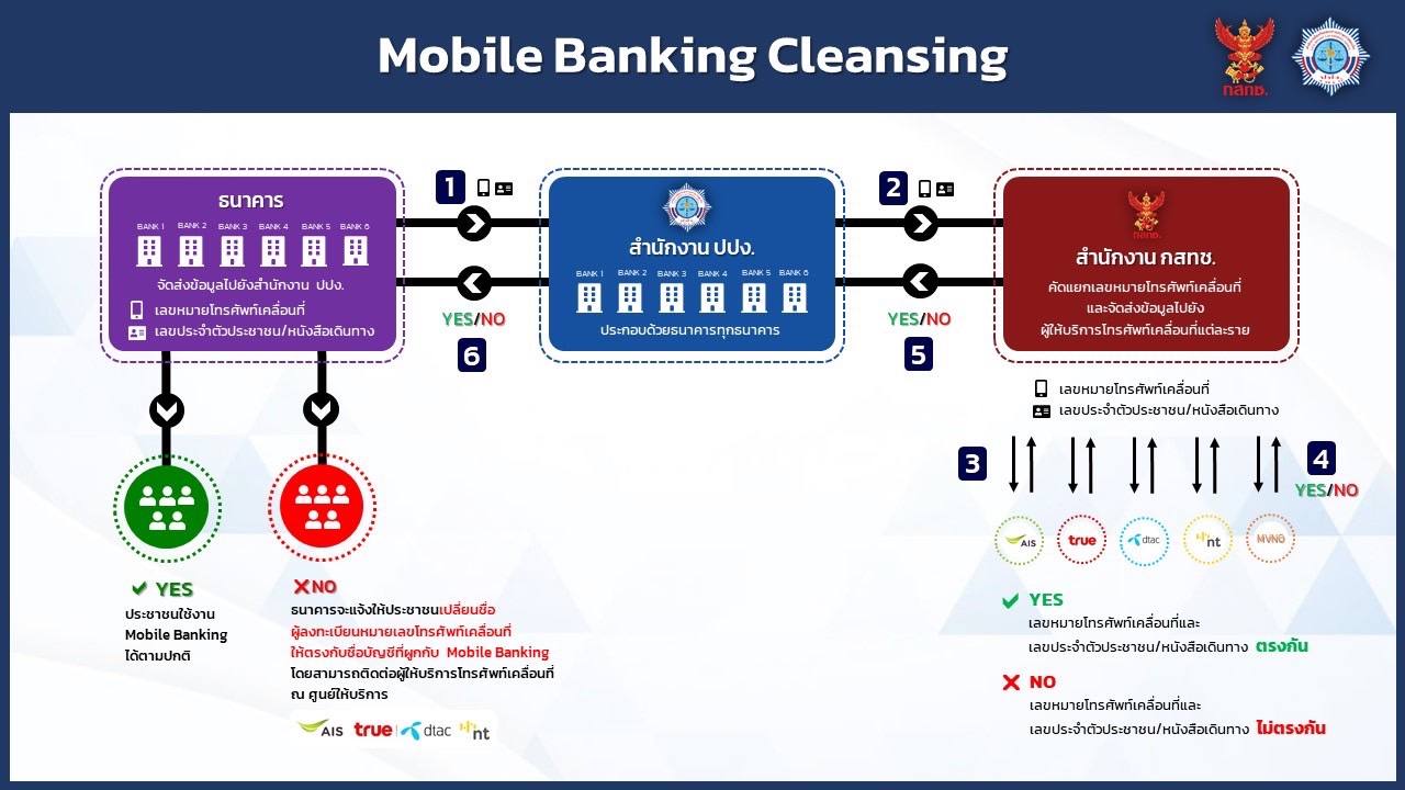 3. กสทช. รับข้อมูลดังกล่าวจาก ปปง.นำเบอร์โมบายแบงก์กิ้งมาแยกเครือข่าย เพื่อส่งตรวจหารายชื่อผู้ถือครอง และตรวจเปรียบเทียบกับรายชื่อเจ้าของบัญชีว่าเป็นบุคคลคนเดียวกันหรือไม่ แล้วแจ้งผลให้ ปปง. และธนาคารทราบ