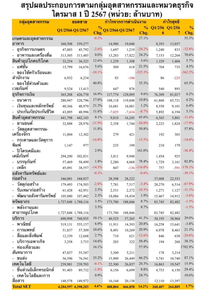 บริษัทจดทะเบียน (บจ.) รายงานผลการดำเนินงานไตรมาส 1 ปี 2567 ภาพรวมรายได้และกำไรสุทธิเติบโตต่อเนื่องจากจำนวนนักท่องเที่ยวที่เพิ่มมากกว่างวดเดียวกันของปีก่อน และธุรกิจการเงินได้รับผลบวกจากอัตราดอกเบี้ยที่เพิ่มขึ้น