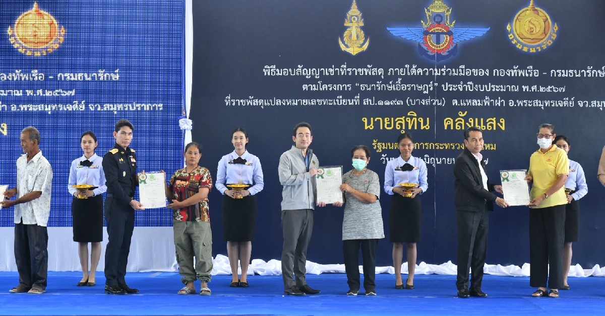 นายสุทิน คลังแสง รัฐมนตรีว่าการกระทรวงกลาโหม และนายเผ่าภูมิ โรจนสกุล รัฐมนตรีช่วยว่าการกระทรวงการคลัง เป็นประธานพิธีมอบสัญญาเช่าที่ราชพัสดุ ภายใต้ความร่วมมือของกองทัพเรือ-กรมธนารักษ์ ตามโครงการ ”ธนารักษ์เอื้อราษฎร์” ประจำปีงบประมาณ พ.ศ.2567 ที่ราชพัสดุแปลงหมายเลขทะเบียนที่ สป.1193 (บางส่วน) ต.แหลมฟ้าผ่า อ.พระมุทรเจดีย์ จ.สมุทรปราการ ตามนโยบายของรัฐบาลในการแก้ไขปัญหาลดความเหลื่อมล้ำของประชาชน