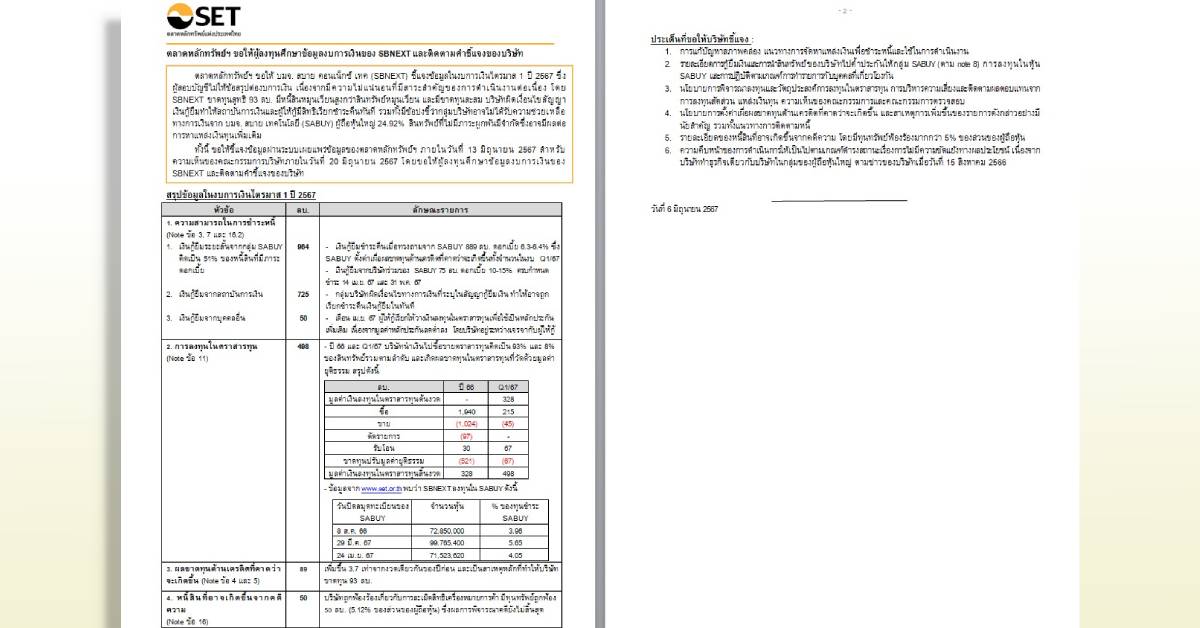 ทั้งนี้ ขอให้ชี้แจงข้อมูลผ่านระบบเผยแพร่ข้อมูลของตลาดหลักทรัพย์ฯ ภายในวันที่ 13 มิถุนายน 2567 สำหรับความเห็นของคณะกรรมการบริษัทภายในวันที่ 20 มิถุนายน 2567 โดยขอให้ผู้ลงทุนศึกษาข้อมูลงบการเงินของ SBNEXT และติดตามคำชี้แจงของบริษัท
