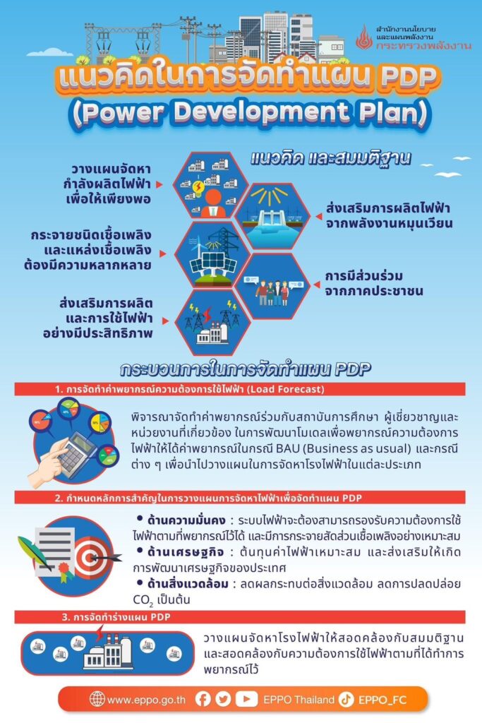 โดยแผนพัฒนากำลังผลิตไฟฟ้าของประเทศไทย พ.ศ. 2567-2580 (Power Development Plan: PDP 2024) ฉบับนี้ ให้ความสำคัญใน 3 ด้าน ประกอบด้วย 1. ความมั่นคงของระบบไฟฟ้าของประเทศ (Security) 2. ต้นทุนค่าไฟฟ้าอยู่ในระดับที่เหมาะสม (Economy) และ 3.ผลกระทบด้านสิ่งแวดล้อม (Ecology) เพื่อให้สอดคล้องกับแผนพลังงานชาติ (National Energy Plan) ที่ สนพ. กำลังจัดทำอยู่ นอกจากนี้ในแผน PDP 2024 จะใช้เกณฑ์โอกาสเกิดไฟฟ้าดับ (LOLE) ต้องไม่เกิน 0.7 วันต่อปี หรือไม่เกิน 17 ชั่วโมง จาก 8,760 ชั่วโมง จากเดิมใช้เกณฑ์กำลังผลิตไฟฟ้าสำรอง (Reserve Margin) รวมทั้งยังกำหนดเป้าหมายของมาตรการเปลี่ยนแปลงพฤติกกรรมการใช้ไฟฟ้า (Demand response) 1,000 เมกะวัตต์ และมาตรการลดความต้องการใช้ไฟฟ้าสูงสุด (Peak) รวมไปถึงจะมีโรงไฟฟ้าใหม่ และเทคโนโลยีใหม่ที่จะนำมาพิจารณา ได้แก่ โรงไฟฟ้าพลังน้ำสูบกลับ รับซื้อไฟฟ้าพลังน้ำจากต่างประเทศ โซลาร์ โซลาร์ลอยน้ำ และโซลาร์บวกด้วยระบบกักเก็บพลังงานด้วยแบตเตอรี่ (Battery Energy Storage System : BESS) มีพลังงานนิวเคลียร์ขนาดเล็ก (SMR) เป็นทางเลือก