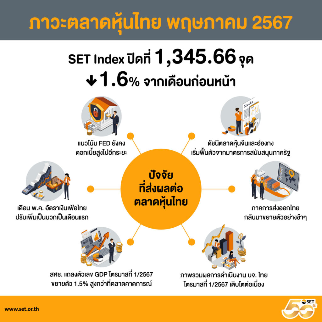 ตลาดหลักทรัพย์ฯ 6 มิ.ย. – ตลท.เผย SET Index พ.ค.67 ลดลง 1.6% นักลงทุนรอความชัดเจนมาตรการกระตุ้นเศรษฐกิจ-ตลาดทุน หลังปรับ ครม.เศรษฐกิจ คจับตาเฟดยังคงดอกเบี้ย หลังเงินเฟ้อลดช้ากว่าคาด เชื่อครึ่งหลังปีนี้หุ้นไทยดีขึ้น