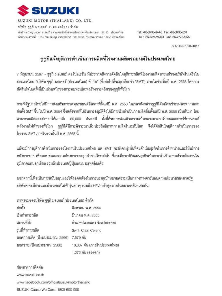 วันนี้ (7 มิ.ย.) ซูซูกิ มอเตอร์ คอร์ปอเรชั่น ออกแถลงการณ์ว่า ซูซูกิตัดสินใจยุติการผลิตที่โรงงานประเทศไทย คือ บริษัท ซูซูกิ มอเตอร์ (ประเทศไทย) จำกัด (SMT) ภายในช่วงสิ้นปี พ.ศ.2568 ซึ่งเป็นส่วนหนึ่งของการทบทวนโครงสร้างการผลิตของซูซูกิทั่วโลก