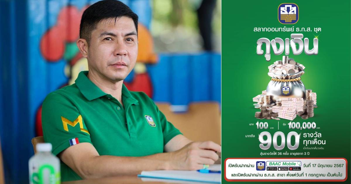 ธ.ก.ส. เปิดรับฝากสลาก ธ.ก.ส. ชุดถุงเงิน เพียงหน่วยละ 100 บาท วงเงินรวม 1 แสนล้านบาท ลุ้นโชครางวัลมูลค่า 100,000 บาท จำนวน 900 รางวัลทุกเดือน รวม 36 ครั้ง และรางวัลพิเศษ 1 ล้านบาททุกปี รวมมูลค่ารางวัล 3,243 ล้านบาท ฝากครบ 3 ปี รับดอกเบี้ยทันที หน่วยละ 1.90 บาท เปิดรับฝากผ่านแอปพลิเคชัน BAAC Mobile 17 มิ.ย. และที่เคาน์เตอร์ ธ.ก.ส. ทุกสาขา 1 ก.ค. นี้