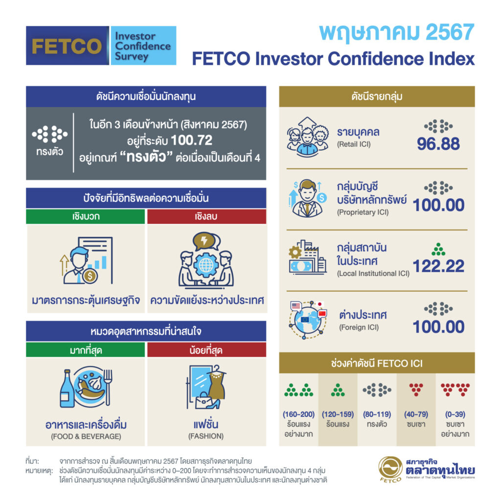 นายกอบศักดิ์ ภูตระกูล ประธานกรรมการสภาธุรกิจตลาดทุนไทย เปิดเผยดัชนีความเชื่อมั่นนักลงทุน (FETCO Investor Confidence Index) ผลสำรวจในเดือนพฤษภาคม 2567 (23–31 พ.ค.67) พบว่าดัชนีความเชื่อมั่นนักลงทุน (FETCO Investor Confidence Index: ICI) ในอีก 3 เดือนข้างหน้าอยู่ที่ระดับ 100.72 โดยยังคงอยู่ในเกณฑ์ “ทรงตัว” ต่อเนื่องเป็นเดือนที่ 4 นักลงทุนมองว่ามาตรการกระตุ้นเศรษฐกิจของภาครัฐ เป็นปัจจัยหนุนความเชื่อมั่นมากที่สุด รองลงมาคือนโยบายการเงินของธนาคารกลางสหรัฐฯ (FED) และการฟื้นตัวของเศรษฐกิจในประเทศ ในขณะที่ปัจจัยที่ฉุดความเชื่อมั่นนักลงทุนมากที่สุด ได้แก่ สถานการณ์ความขัดแย้งระหว่างประเทศ รองลงมาคือสถานการณ์เงินเฟ้อ และความผันผวนของค่าเงินบาท